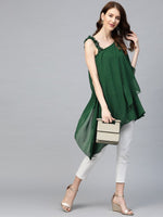 • Green and golden printed Layered Tunic with gotta patti and ruffle detail, has stylised V-neck, three-quarter sleeves, and asymmetric hem