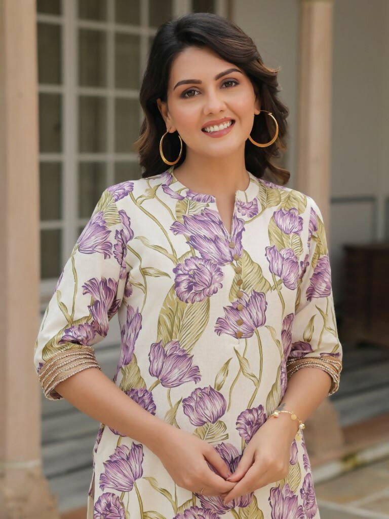 Aramya Straight Linen Cotton Floral Print Women's Kurta - Off WhiteElevate your style with our uniquely designed kurta, perfect for daily wear or c...