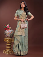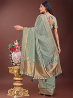 Unveil your graceful side with this timeless Light Green organza saree, featuring intricate golden zari border and pallu. Its soft, sheer fabric offers a luxurious feel with a modern appeal, ideal for weddings, festive celebrations, and parties. The striking geometric woven texture adds depth while maintaining elegance. Comes with a matching unstitched blouse piece to complete your look.Whether you're a bridesmaid, attending a puja, or heading to a formal event, this saree is the epitome of elegance and tradition with a contemporary twist.