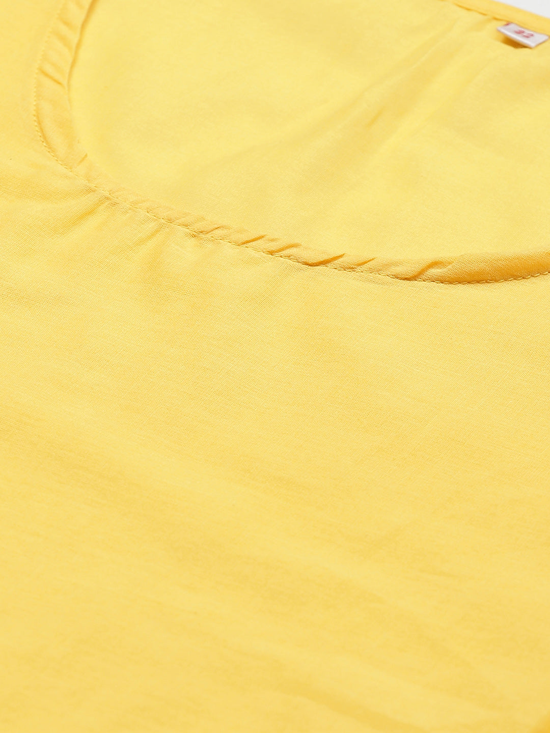 Yellow solid straight kurta, has a round neck, sleeveless, straight hem, side slits