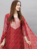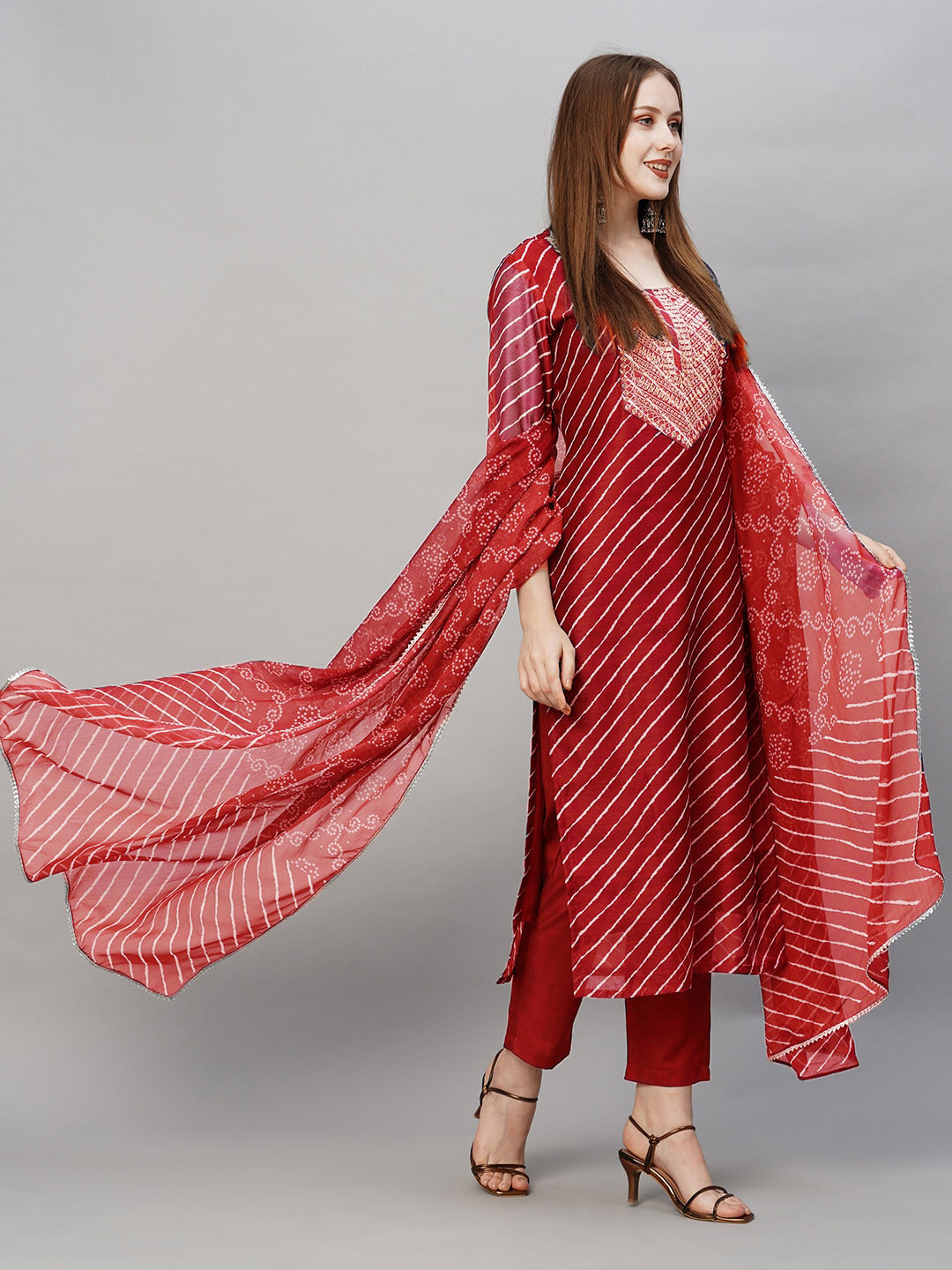 Kalini Leheriya Printed Thread Work Straight Kurta With Trousers & Dupatta Product Details Red printed Kurta with Trousers with dupattaKurta...