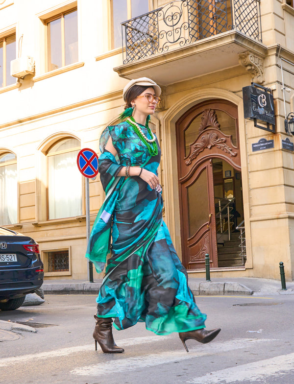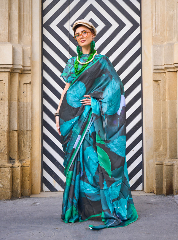 Elegance And Regal Come Together In This Beautiful Drape. Be The Dazzling Diva In This Black Colour Satin Georgette Versatile Saree With Exquisite Designs And Patterns. The Fancy Floral And Abstract Print Work Looks Chic And Perfect For Both Casual And Formal Events. Comes With Matching Blouse.