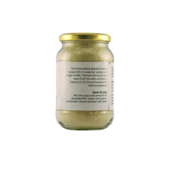 • The time tested grandmother's recipe rich in soapnut, pulses and finger millet. Made with utmost care and purest ingredients, this body wash powder is a different experience from the usual artificial foam-filled chemical affair. 100% natural and eco-friendly formula to take care of all skin problems and improve skin complexion.