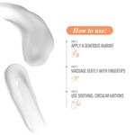 • Apply a generous amount to the skin with your fingertips and massage gently with a soothing, circular motion
