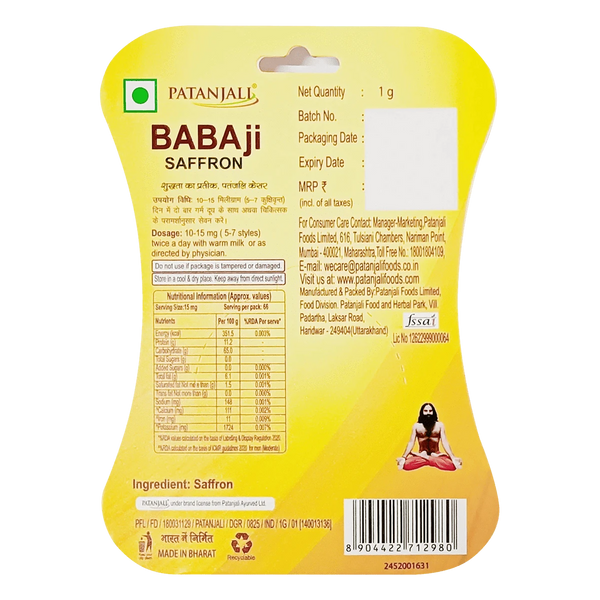Patanjali Babaji SaffronKey IngredientsSaffronSafety Information Use before 18 months from the date of mfg. ...