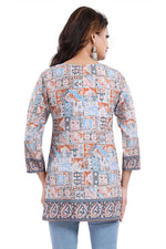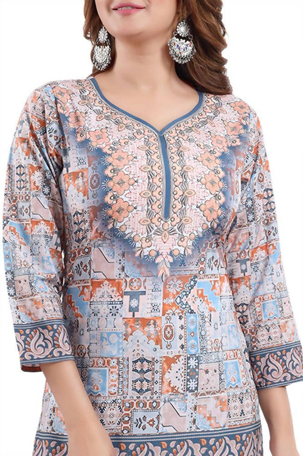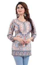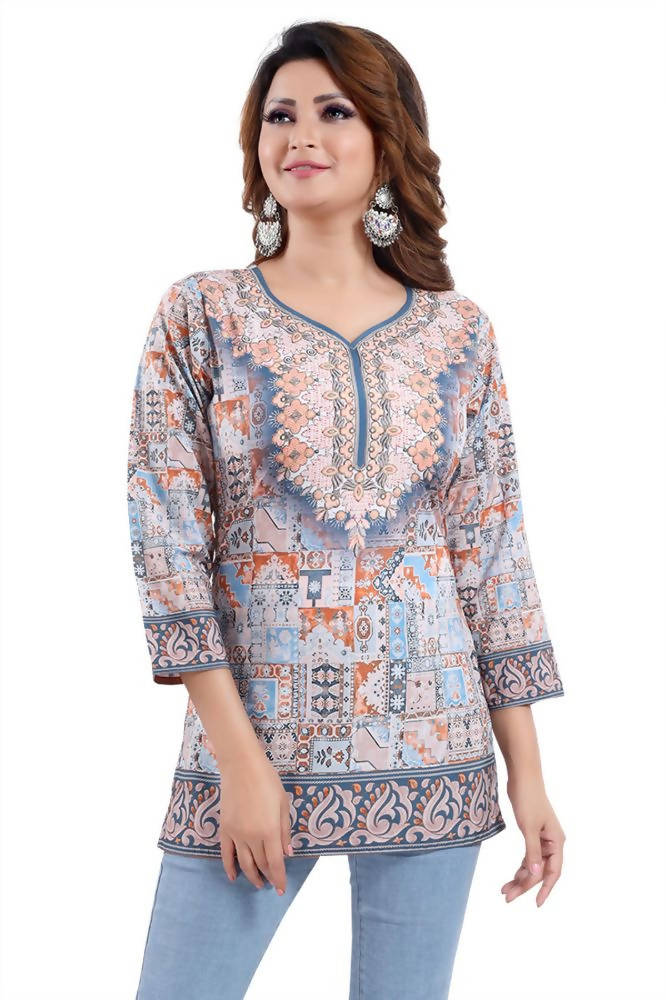 Looking for a cool yet trendy printed kurti? Buy this phenomenal blue faux crepe printed short kurti tunic top solely made and sold by Snehal Creation. This short-length kurti has got an alluring sweetheart neckline and 3/4th sleeves to save your smooth skin from getting tanned. It has got beautiful print all over on the blue base. The neckline, cuffs, and bottom have got a border of different print which makes this kurta stand out from the crowd. It is made from the finest quality of faux crepe which is perfect for summers and the cloth can be washed in a machine thus will save your time.