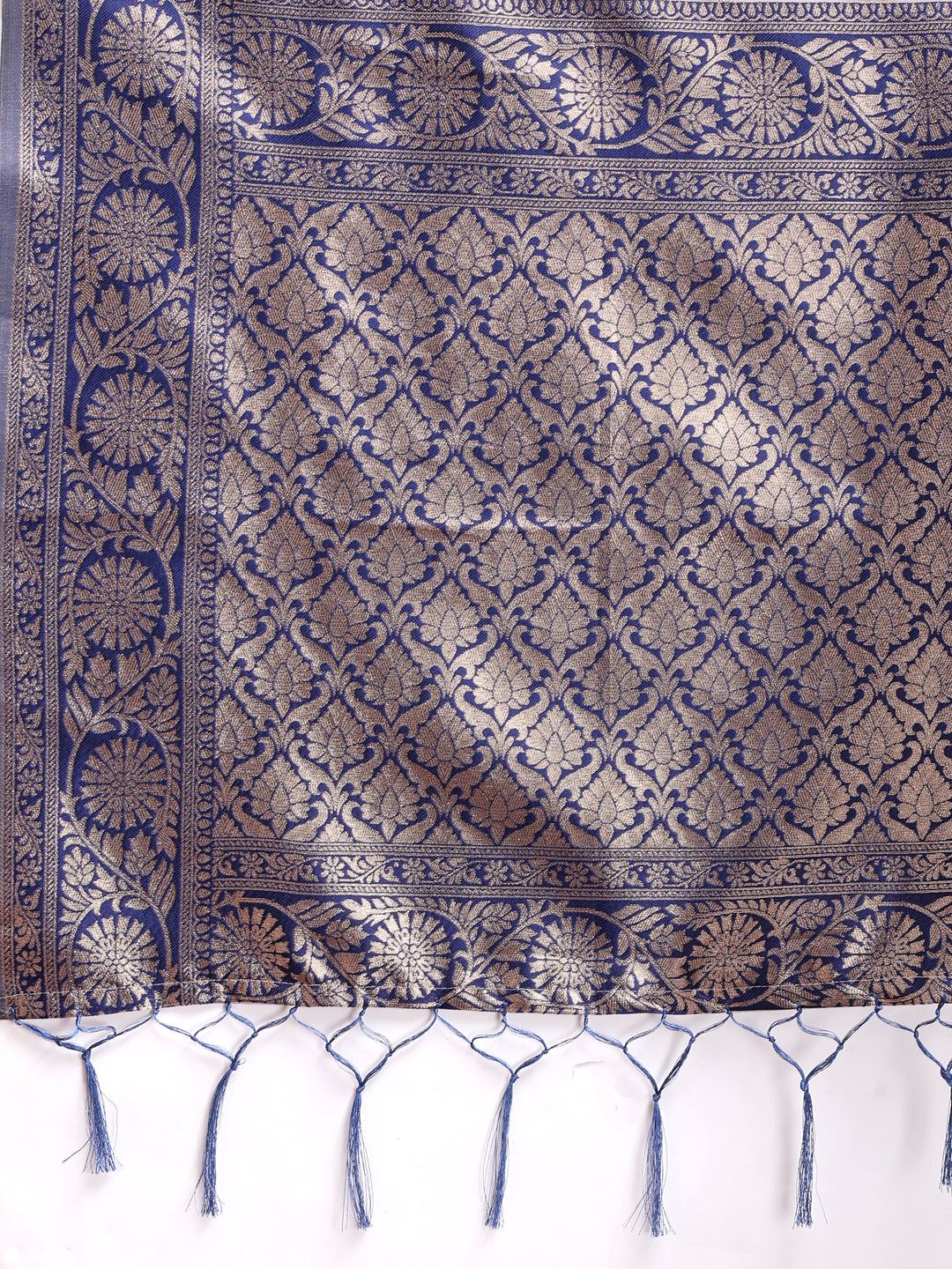 Astita Navy Blue Linen Cotton Woven Zari Work Traditional Tassel Saree - Default Title