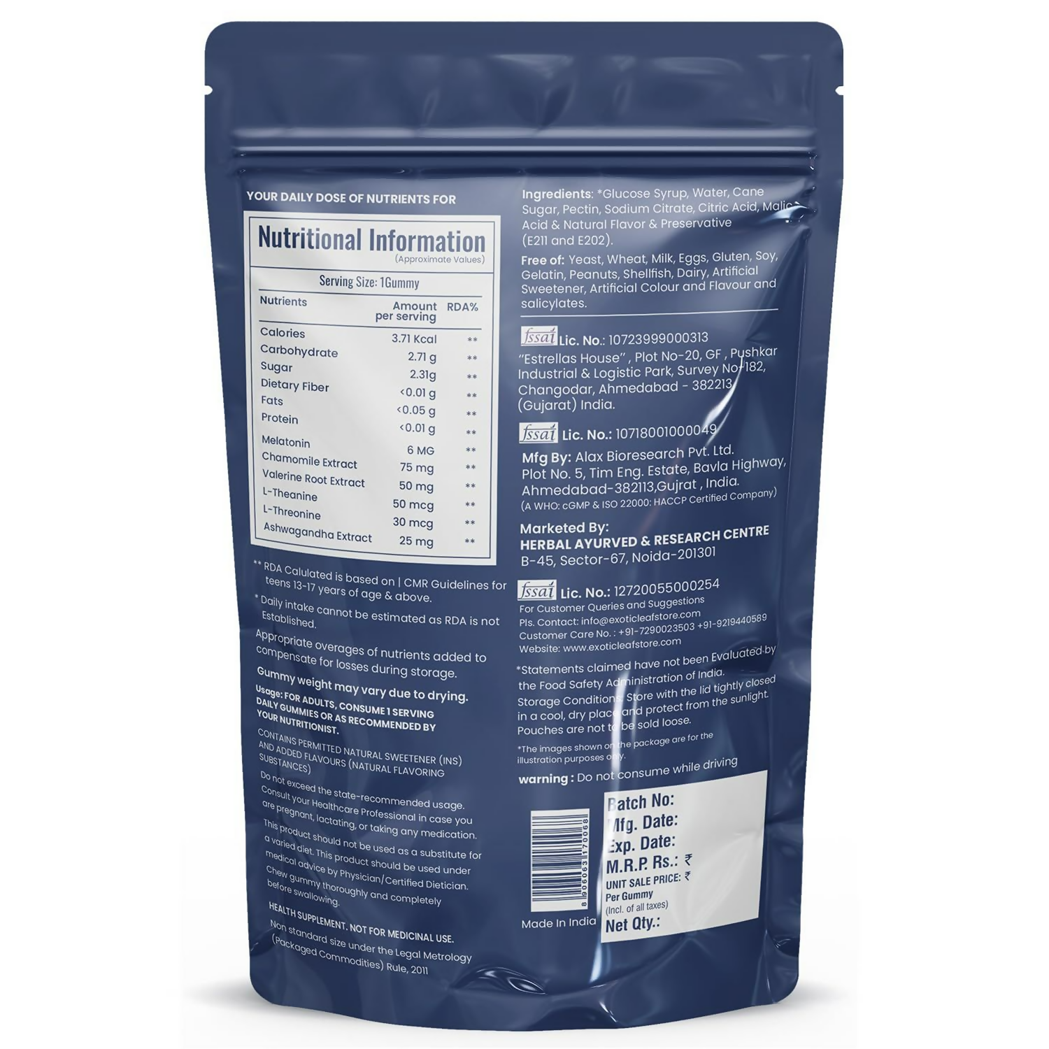 Exotic Leaf Melatonin GummiesIngredients: Dietary Fiber Fats Protein Melatonin Chamomile Extract L-Theanine L-Threonine Ashwagandha Extract Glucose...