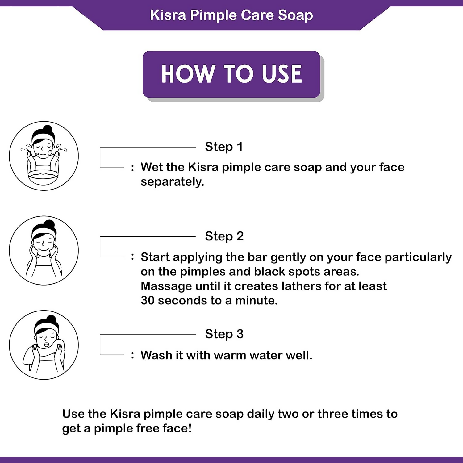 Soap: Splash Face with water, develop rich lather & gently massage over the face skin with fingers or face-cloth for 2 minutes. Rinse off, repeat it if skin is very dry. Wash 1 to 3 times a day.