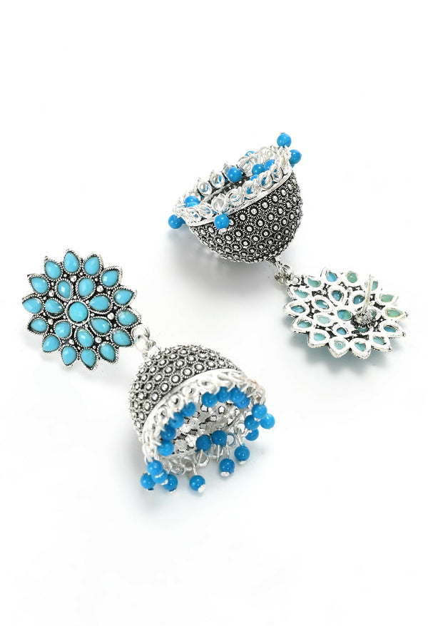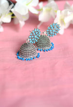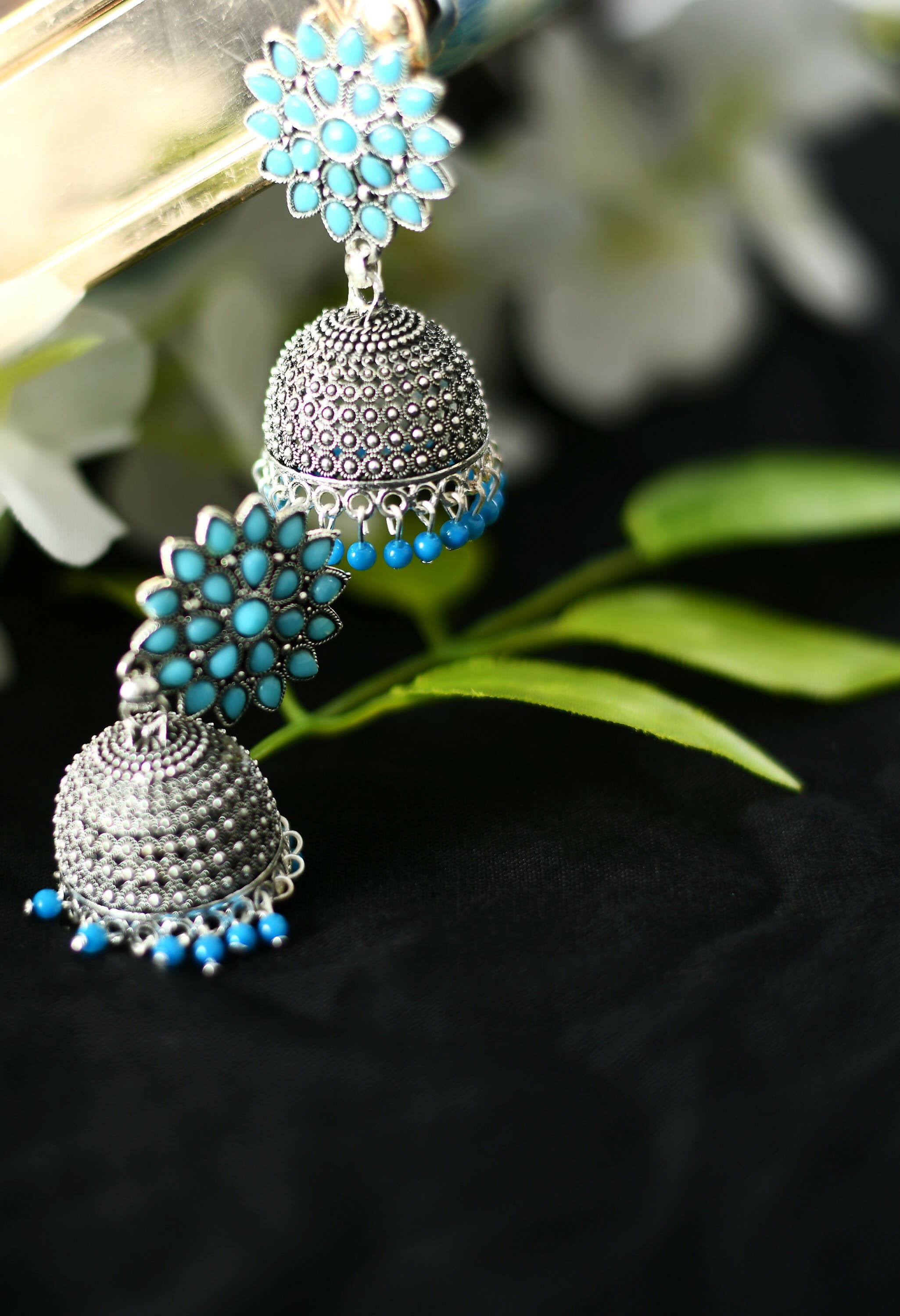Mominos Fashion Joharkamal Kundan work Jhumka with Sky Blue Beads Style/Collection: Oxidised Actual Color: Sky Blue Product Type: Earrings Meta...