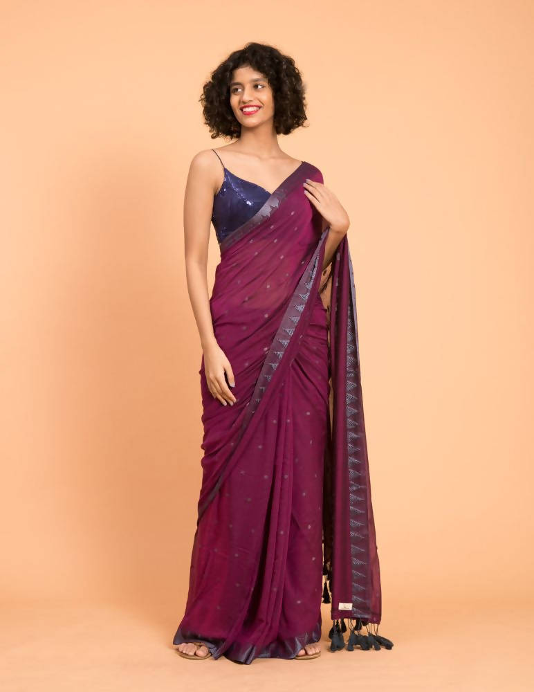 This saree is by Suta Pvt. Ltd. It is made from Cotton Blend and finished in Purple Colour. The saree does not come with a blouse piece The model is wearing a blouse for modelling purpose only