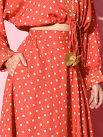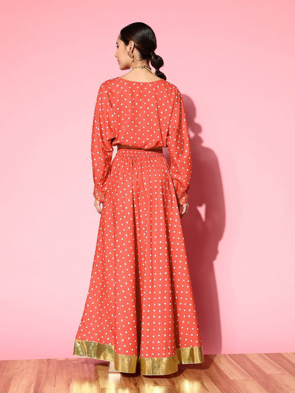 Ahalyaa Printed Crepe Co-Ords PRODUCT DETAILS  Red printed top, has long puff sleeves and round neck with tie-up detailRed Printed A-line Maxi ski...