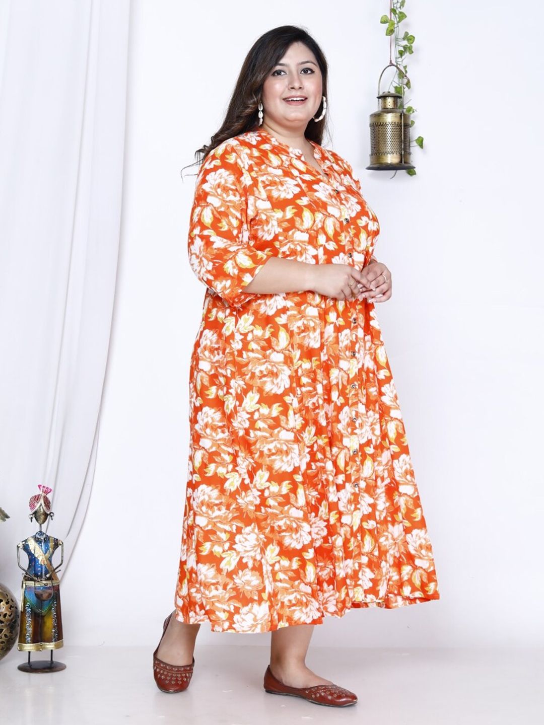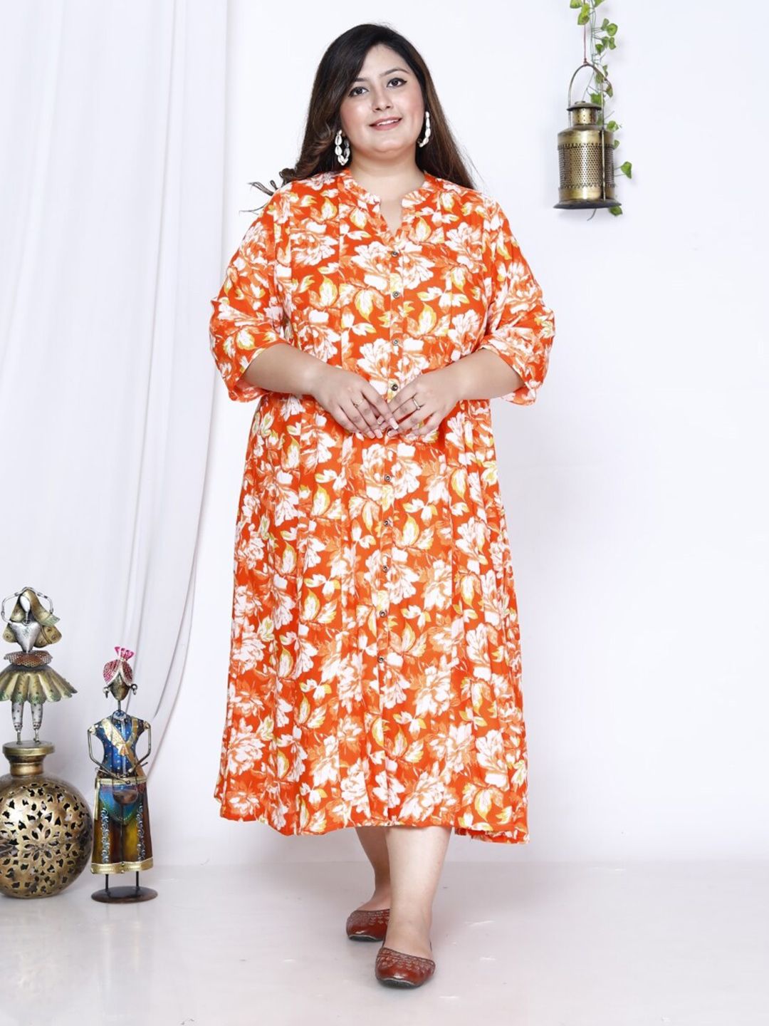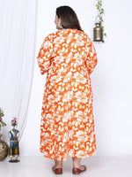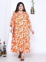 Swasti Plus Size Floral Printed A-Line Midi Dress Product Details Orange floral print maxi dress Round neck Three-quarter, regular sleev...