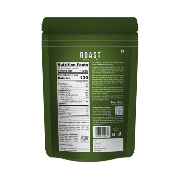 Roast Foods Jowar Puff Cheesy Jalepeno  About the Product:Roasted Jowar Puff Sprinkled with Cheesy Jalepeno Seasoning Legal Disclaimer: Product im...