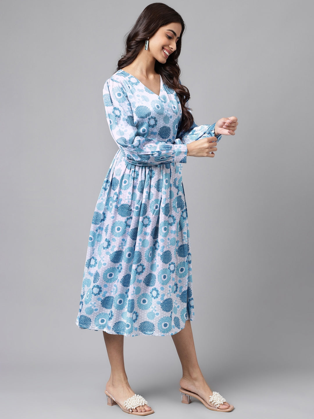 Janasya Women's Grey Satin Digital Floral Printed Flared Casual Dress