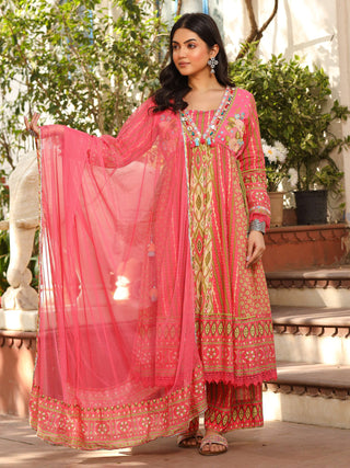 Juniper Women's Pink Georgette Printed Kurta SetFuchsia floral-printed georgette Kurta Pant And Dupatta Set adorned with intricate Zari work and sequins. The calf-length A-line design offers a fit & flare silhouette with a round neck and three-quarter regular sleeves, paired with solid pants and a matching dupatta for a festive look. color: Pink Sleeve Length: 3/4 Sleeve Pattern: Printed Brand Color: Fuchsia Fabric: Georgette Top Type: Kurta Bottom Type: Pant Add On: Dupatta Neck: Round Neck Pattern/Print Type: Floral Sleeve Style: Regular Sleeve Ornamentation Type: Zari Top Fabric: Georgette Bottom Fabric: Cotton Top Length: Calf Length Fabric Care: Hand Wash::Machine Wash Legal Disclaimer: Product color may slightly vary due to photographic lighting sources or your monitor settings.Product ID:17734290