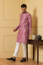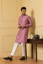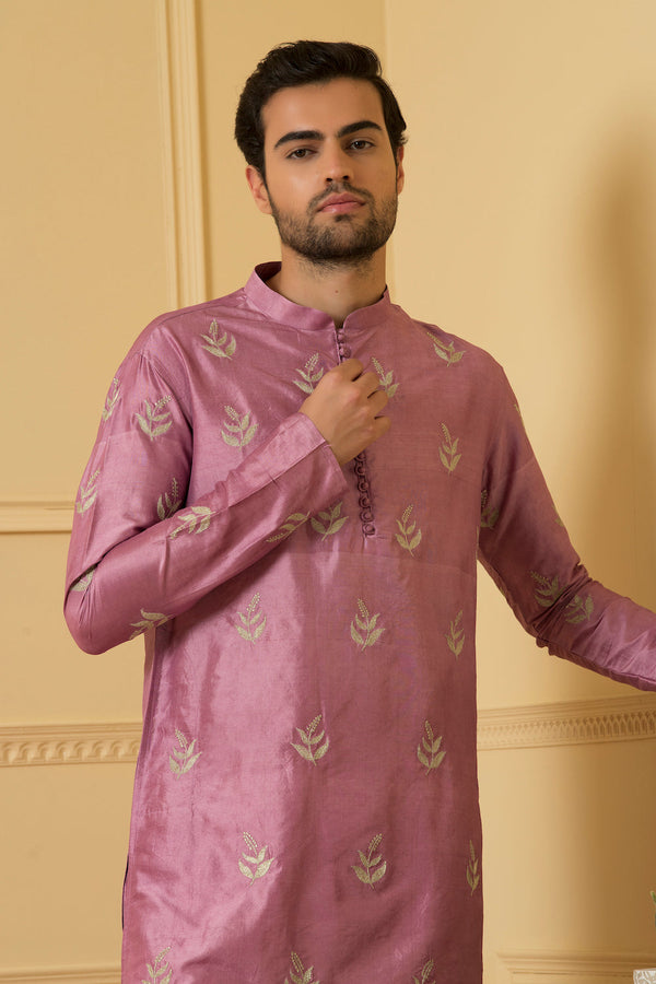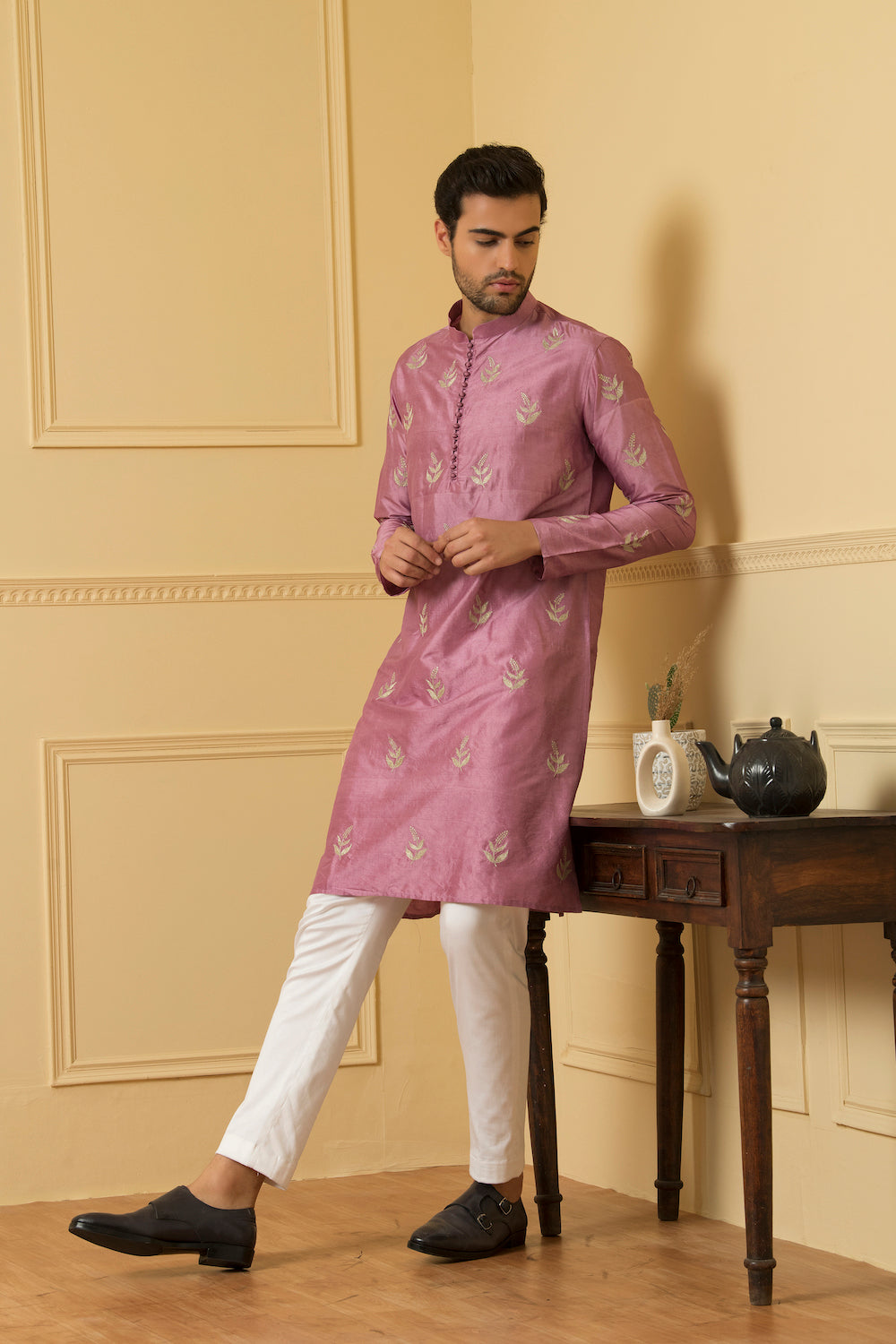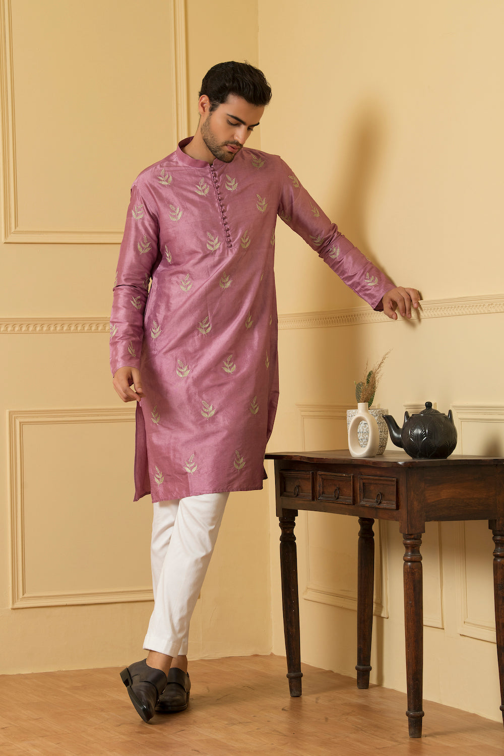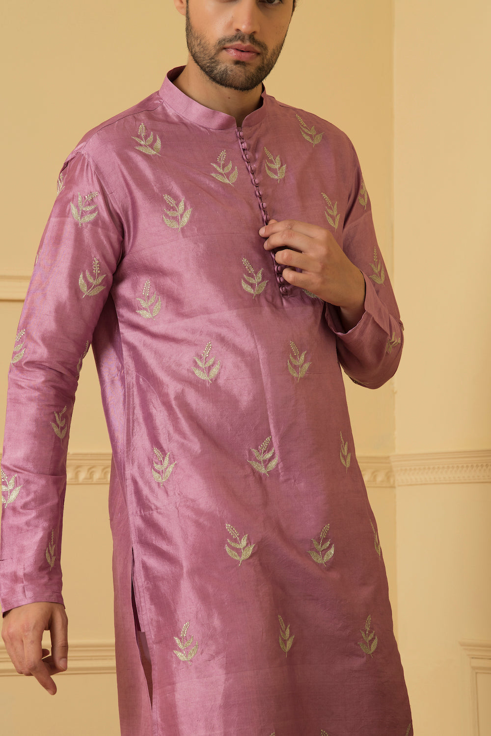 This purple kurta is made of Dupion silk and features intricate leafy embroidery all over the kurta. The embroidery is done in a contrasting color that adds a pop of color to the kurta. The kurta has a classic design with a mandarin collar and full sleeves. It’s perfect for any formal or semi-formal occasion.