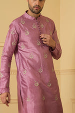 Encanto Designer Men's Kurta by Hilo DesignDescription:  This purple kurta is made of Dupion silk and features intricate leafy embroidery all over ...