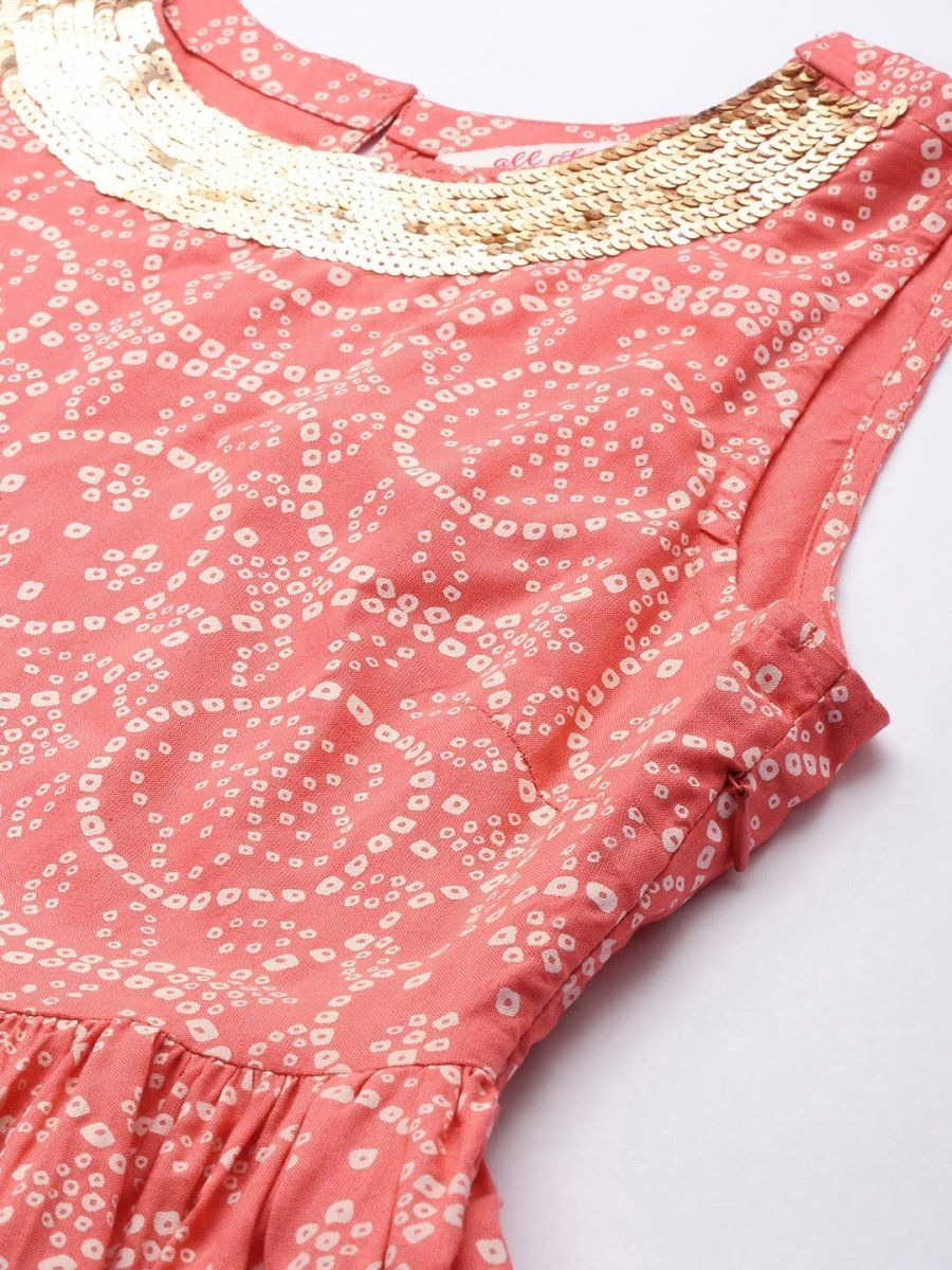 All About You Women Peach Pin & White Bandhani Print Pleated Sequinned Kurti with Palazzos