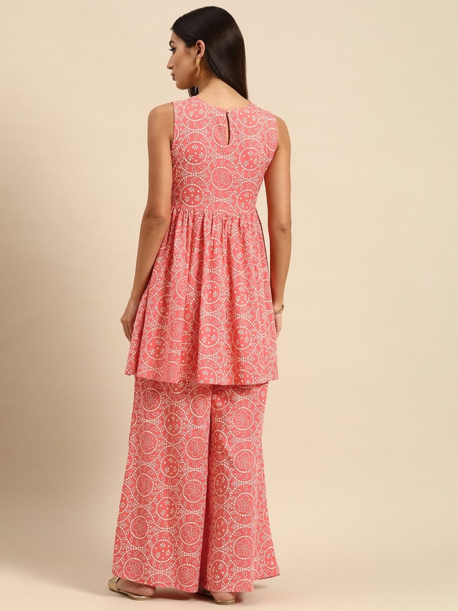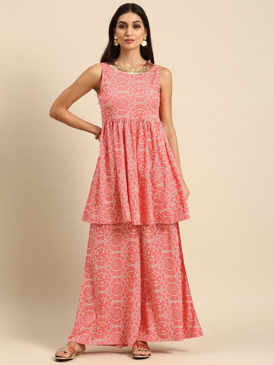 All About You Women Peach Pin & White Bandhani Print Pleated Sequinned Kurti with Palazzos - XS