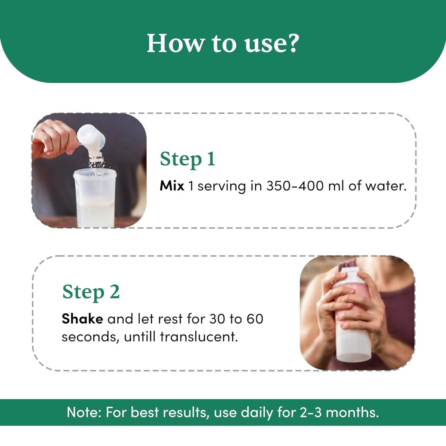 • 2: Shake vigorously and let rest for 30 to 60 seconds, as the powder transforms into a translucent protein beverage.