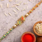 • This ethnic rakhi showcases meenakari work for a traditional look