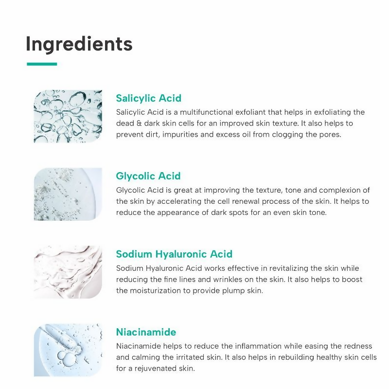 • Gentle Exfoliation: The key actives infused in the essence provide gentle exfoliation to eliminate dead & dull skin cells for a glowing skin.