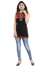 Ensure full comfort and style in this Terrific Black Rayon Cotton Sleeveless Tunic Top with Embellishments from the house of Snehal Creations. This short tunic comes sleeveless and is the perfect summer wear. The shoulder areas of the tunic are done in a beautiful maroon printed fabric. The ban collar and neckline are decorated with embellishments. The printed fabric is also used to create a border on the hemline.