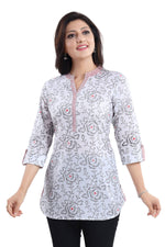 Looking for a comfortable yet stylish tunic for summer? Get your hands on vibrant vigor white cotton printed short tunic top solely designed and made by Snehal Creation. It has 3/4th sleeves with detailing on the cuffs and the high collar makes it look more elegant. The tunic top is made from cotton which has got a beautiful floral print all over that contrasts with the color of the fabric. This tunic is a statement piece for the hot summer days.
