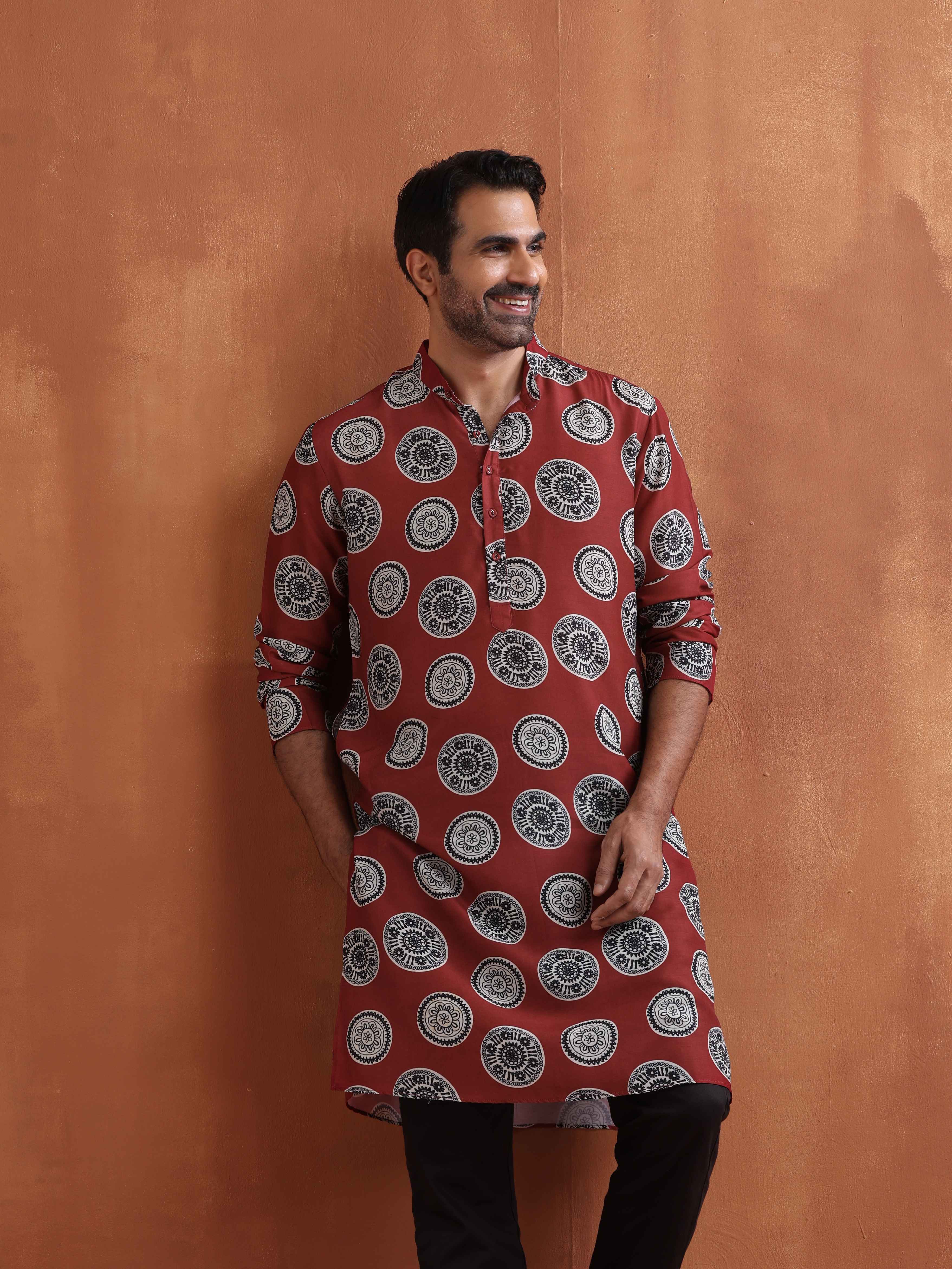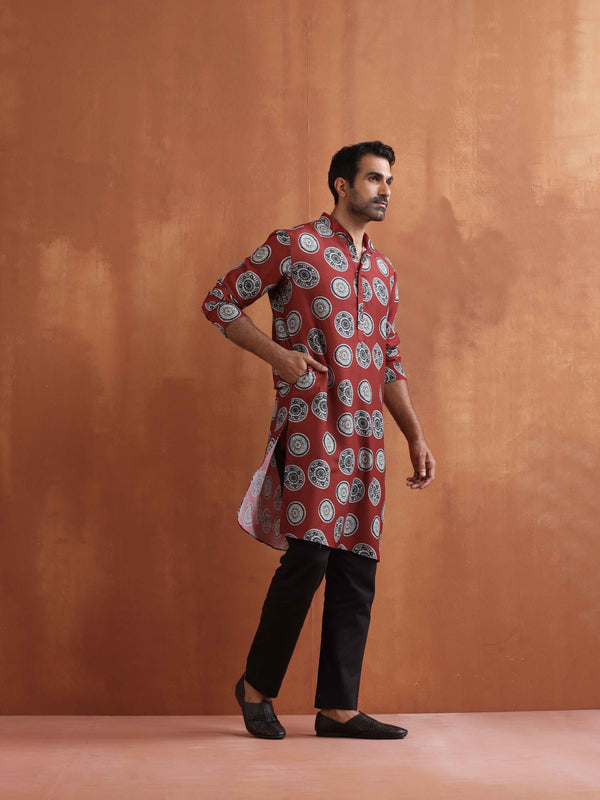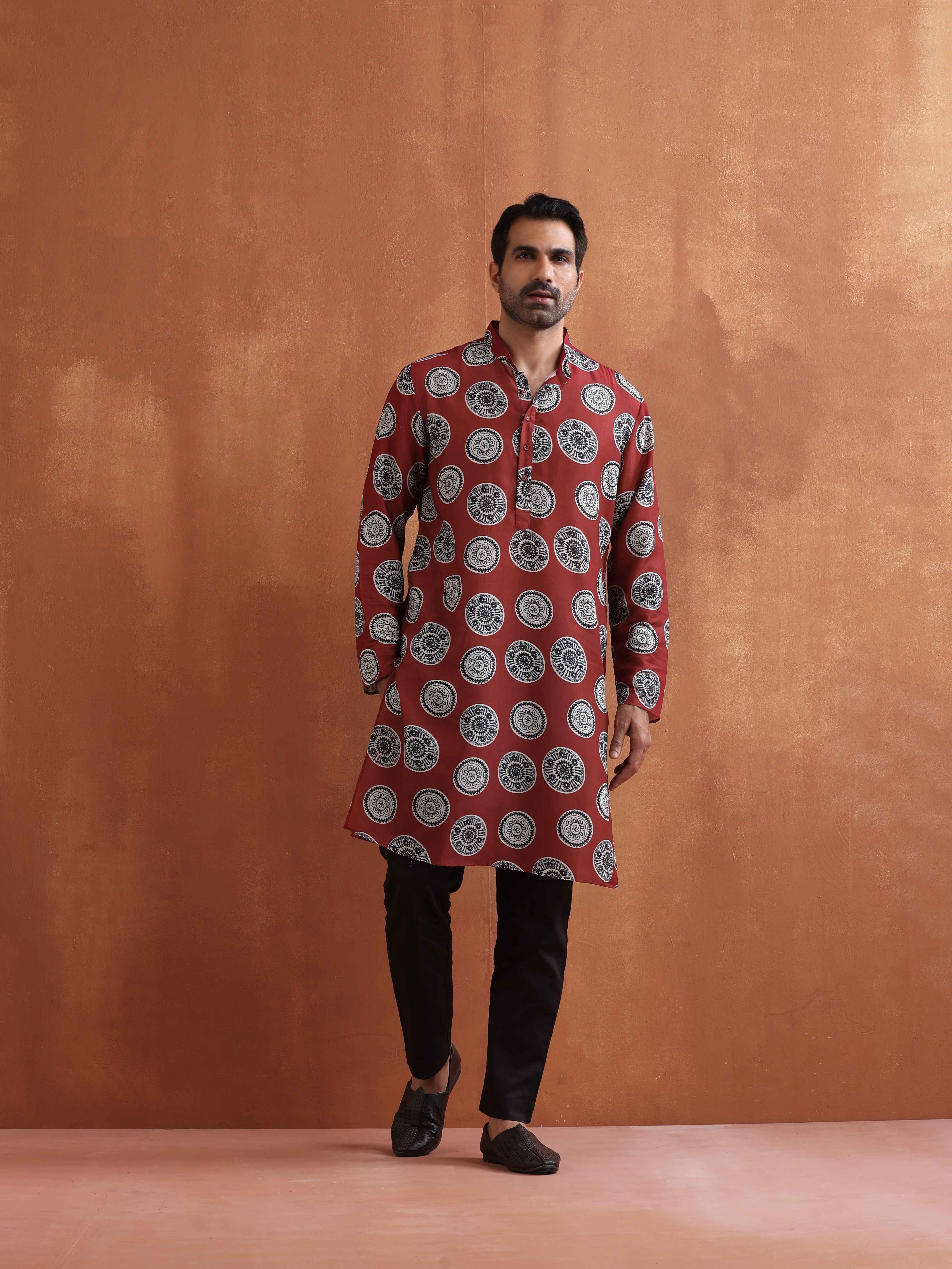 Upgrade your festive wardrobe with this rust viscose blend printed kurta.
