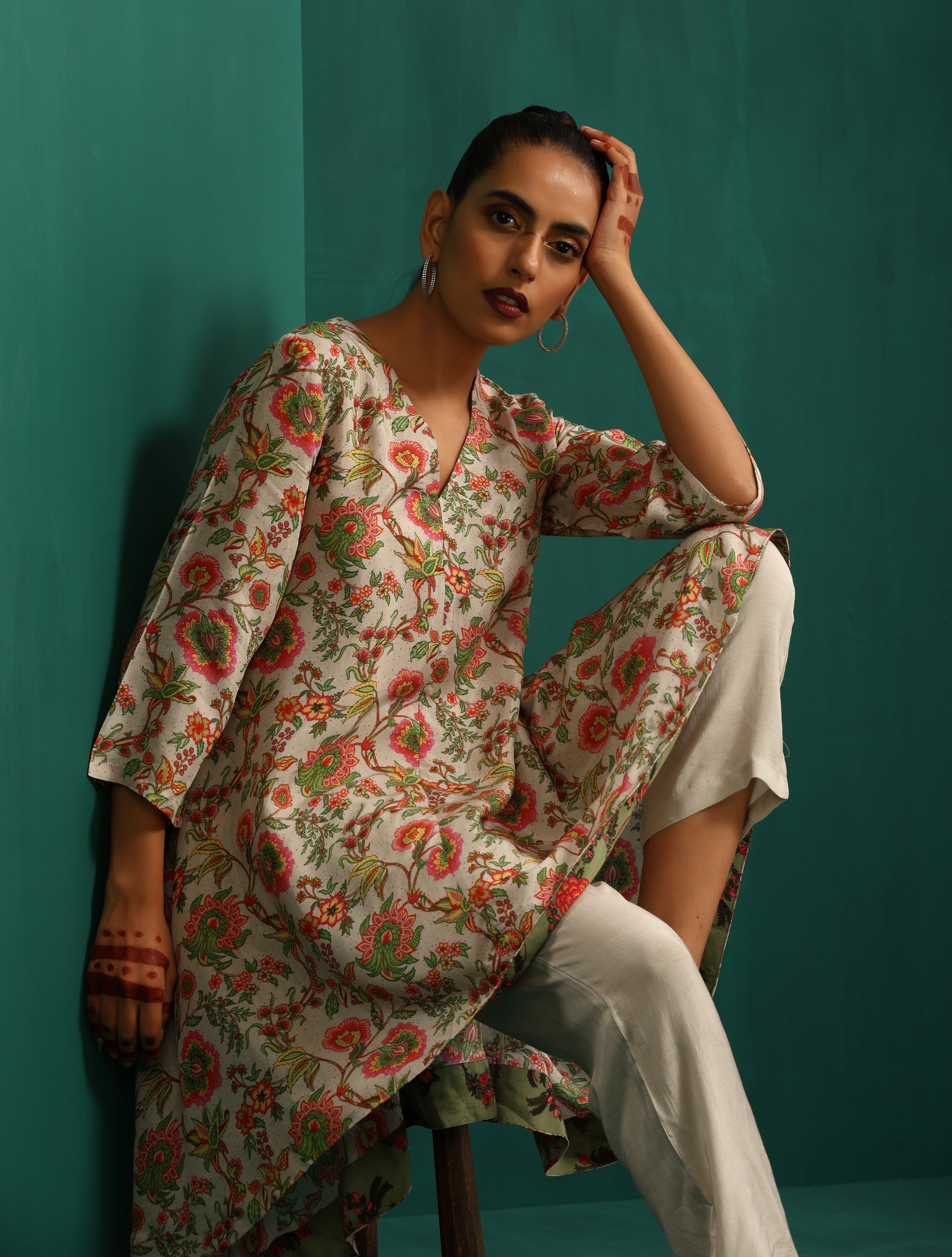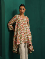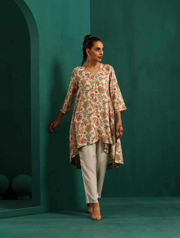 • Muslin Silk Flared Co-ord Set with V-neck and high low hemline. Paired with solid elasticated waist pant.