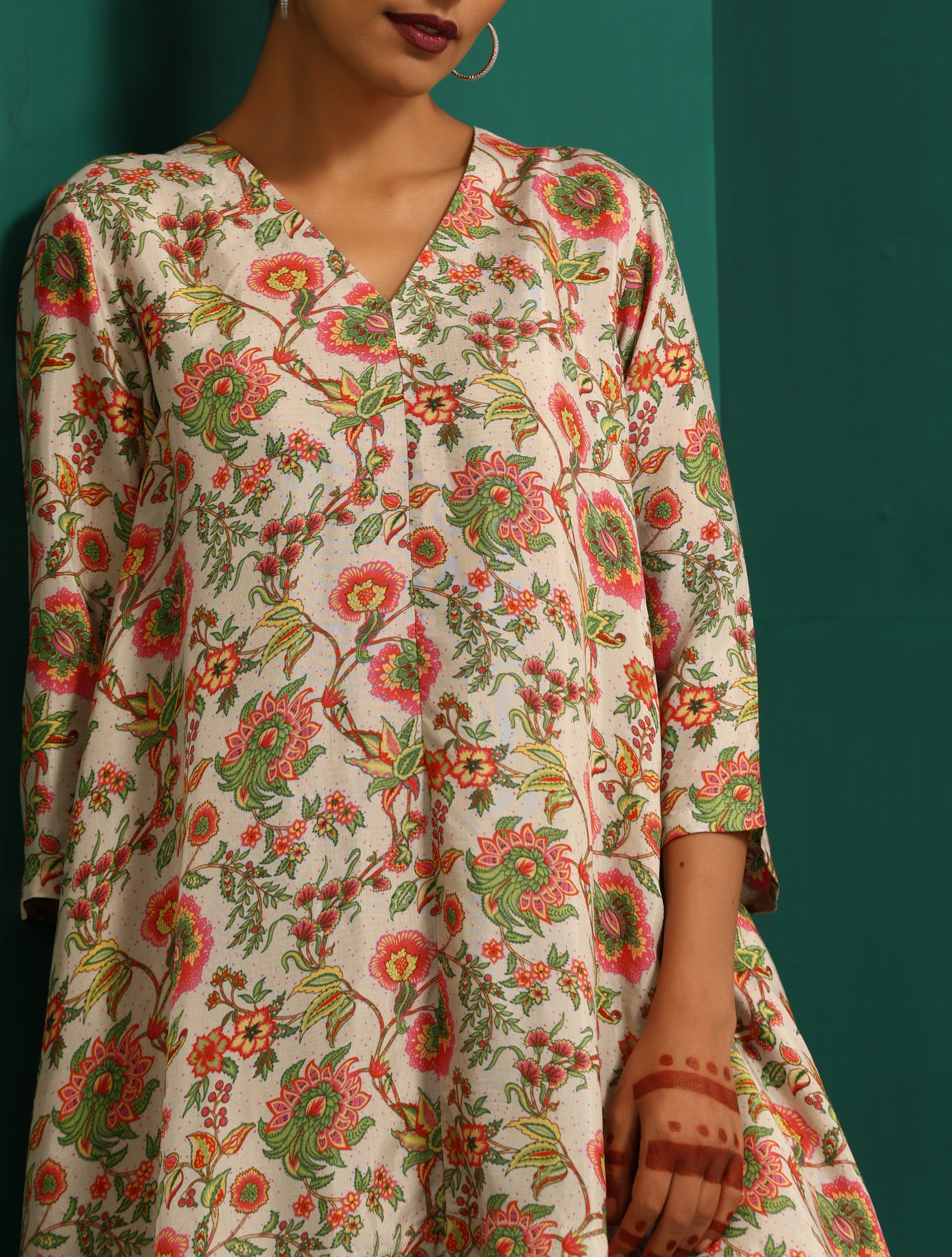 trueBrowns Off white Floral Jaal Muslin Silk Printed High Low Co-ord SetDescription Muslin Silk Flared Co-ord Set with V-neck and high low hemline....