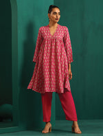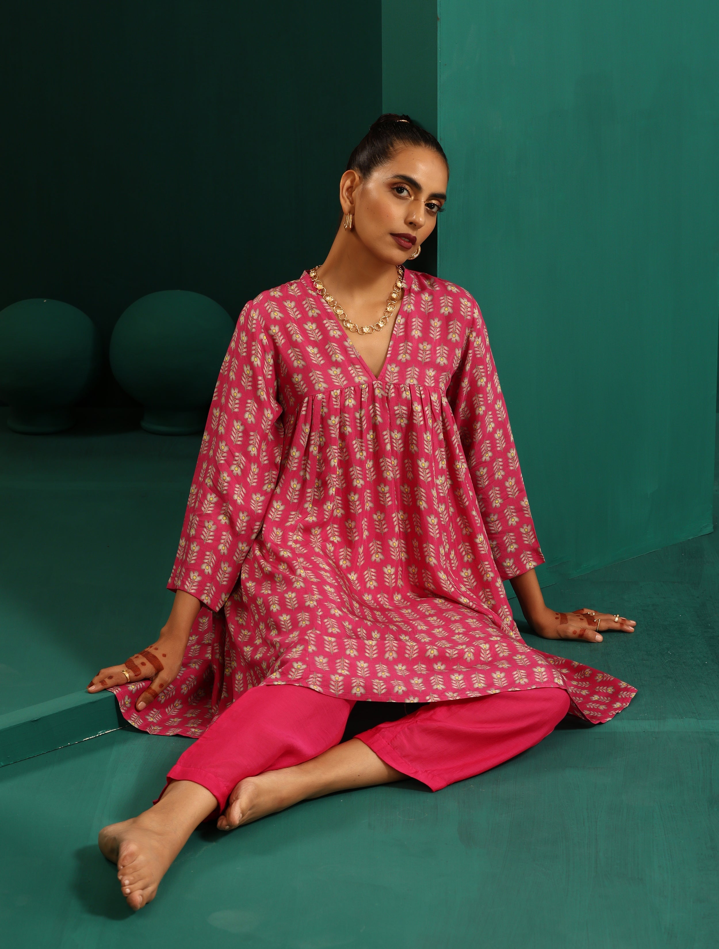 trueBrowns Pink Leaf Muslin Silk Printed Yoke Gathered Co-ord SetDescription Muslin Silk Co-ord Set with Yoke Front Gathered and V- Neck Collar. Pa...