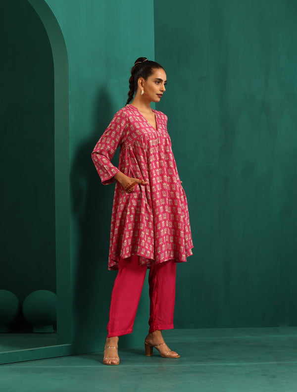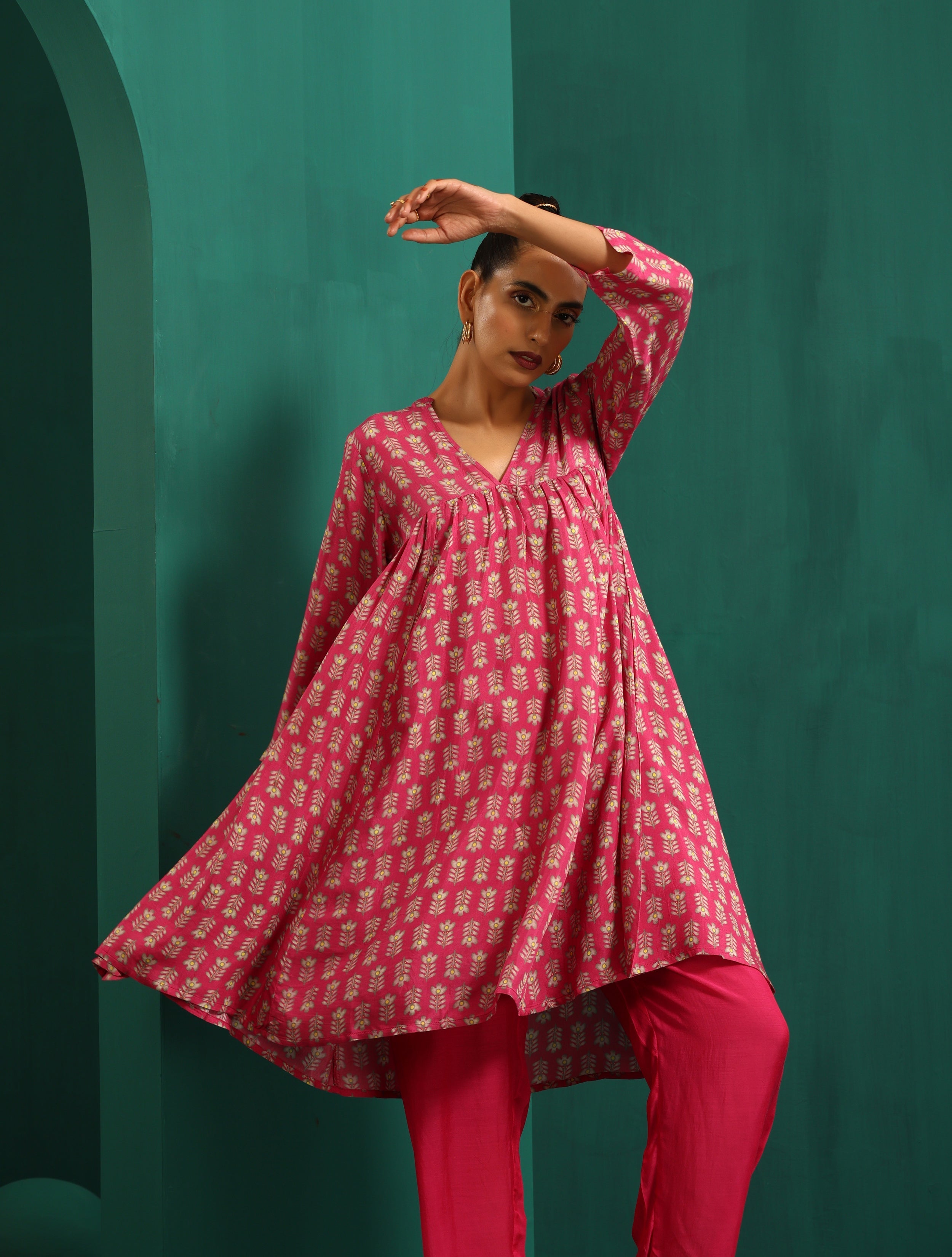 trueBrowns Pink Leaf Muslin Silk Printed Yoke Gathered Co-ord Set
