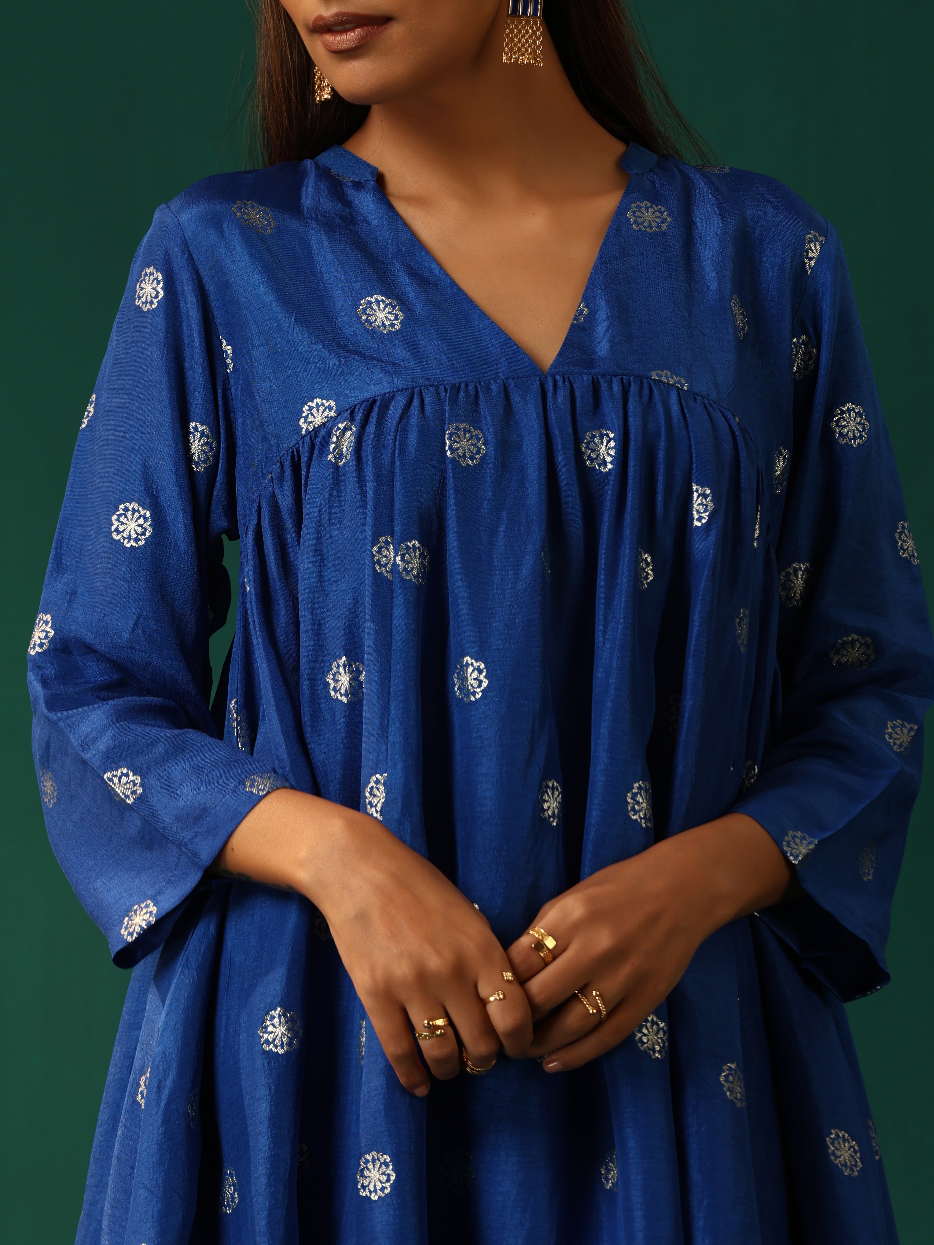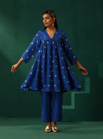 trueBrowns Royal Blue Geometric Floral Viscose Silk Front Gathered Co-ord SetDescription Viscose Silk Co-ord Set with Yoke Front Gathered and V- Ne...