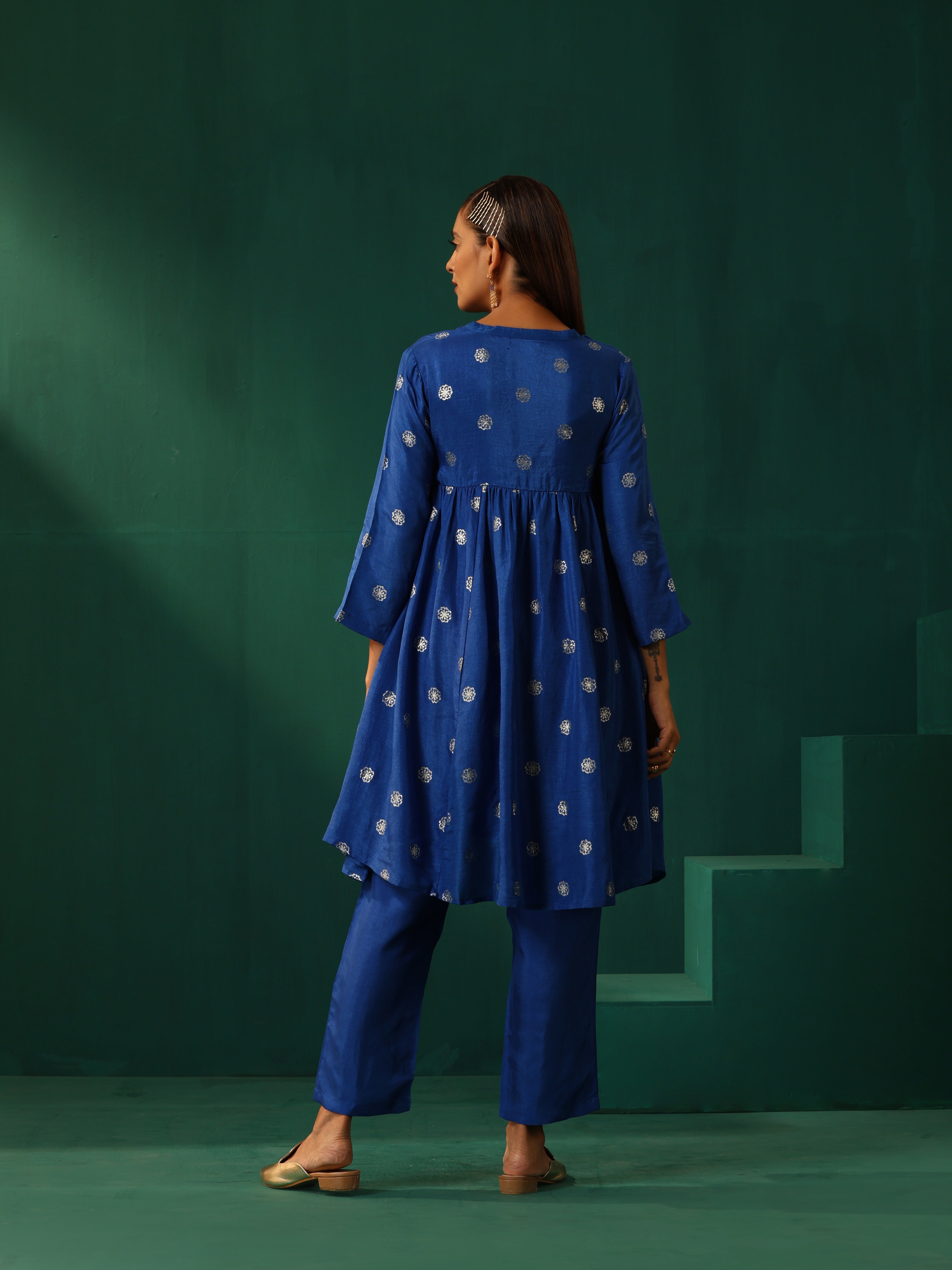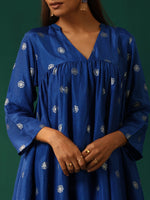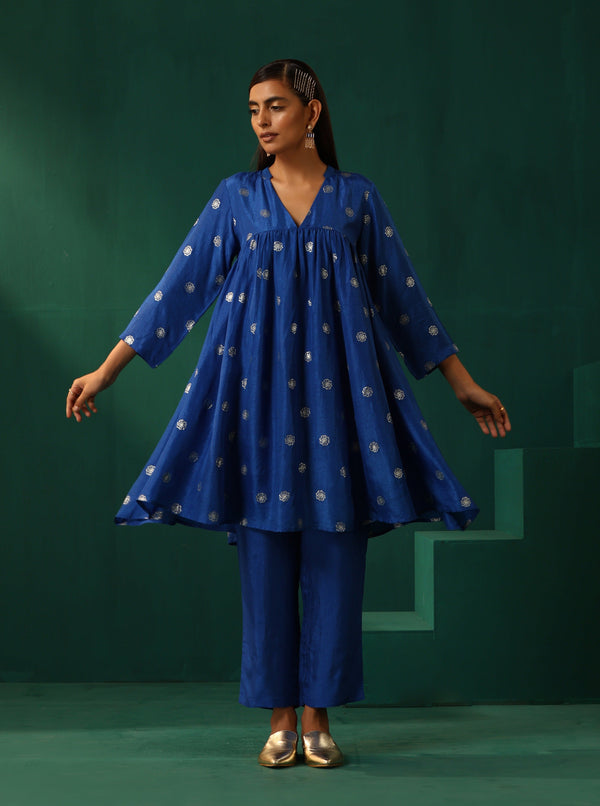 trueBrowns Royal Blue Geometric Floral Viscose Silk Front Gathered Co-ord Set