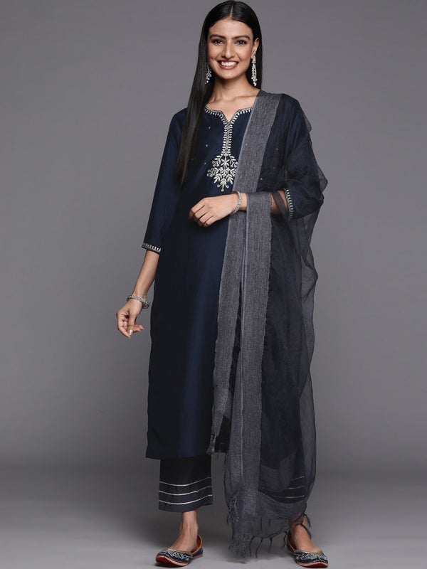 Blue embroidered kurta with contrast bottom and dupatta, kurta has round neck, bottom has gotta lace detailings
