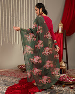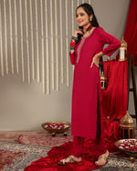 magenta embroidered kurta paired with straight trouser and digital floral printed dupatta, round neckline, straight kurta with side slit,3/4th sleeves