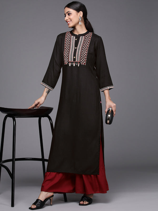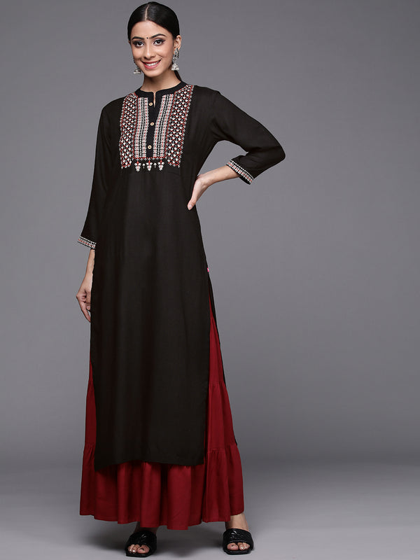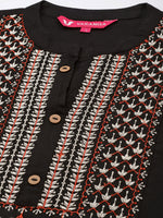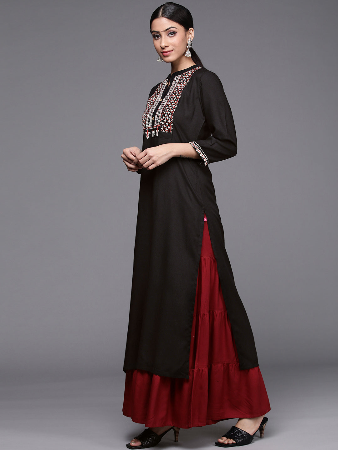 Black and off white ethnic motifs embroidered yoke design mandarin collar three-quarter, regular sleeves straight shape with regular style thread work detail calf length with straight hem machine weave regular viscose rayon.