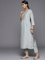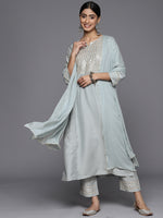 Varanga Women Blue Mirror Work Yoke Embroidered Straight Kurta Paired With Tonal Bottom And Tonal Solid Dupatta With Four Side Fringes