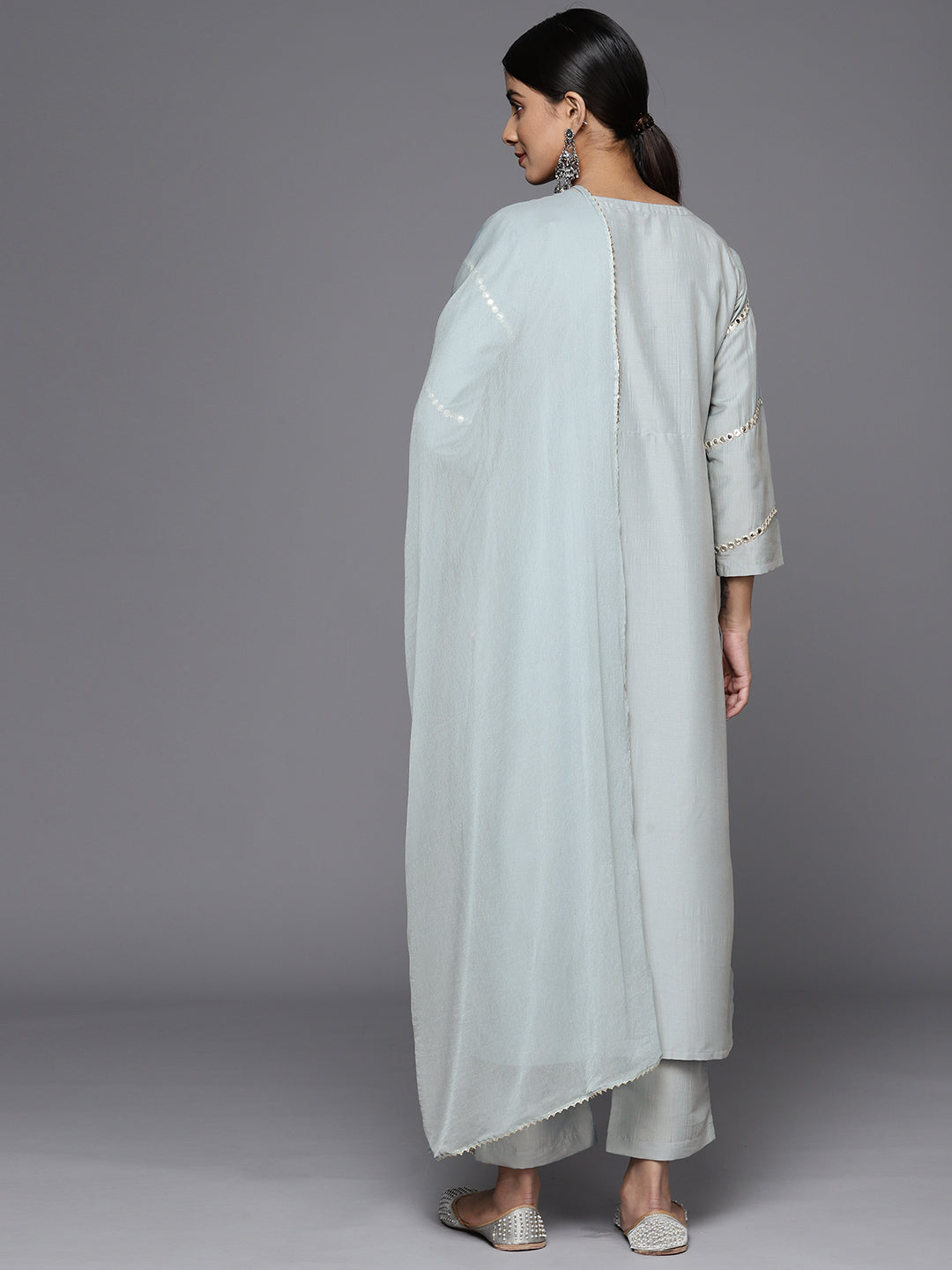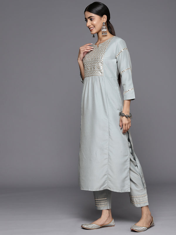 Varanga Women Blue Mirror Work Yoke Embroidered Straight Kurta Paired With Tonal Bottom And Tonal Solid Dupatta With Four Side Fringes - S