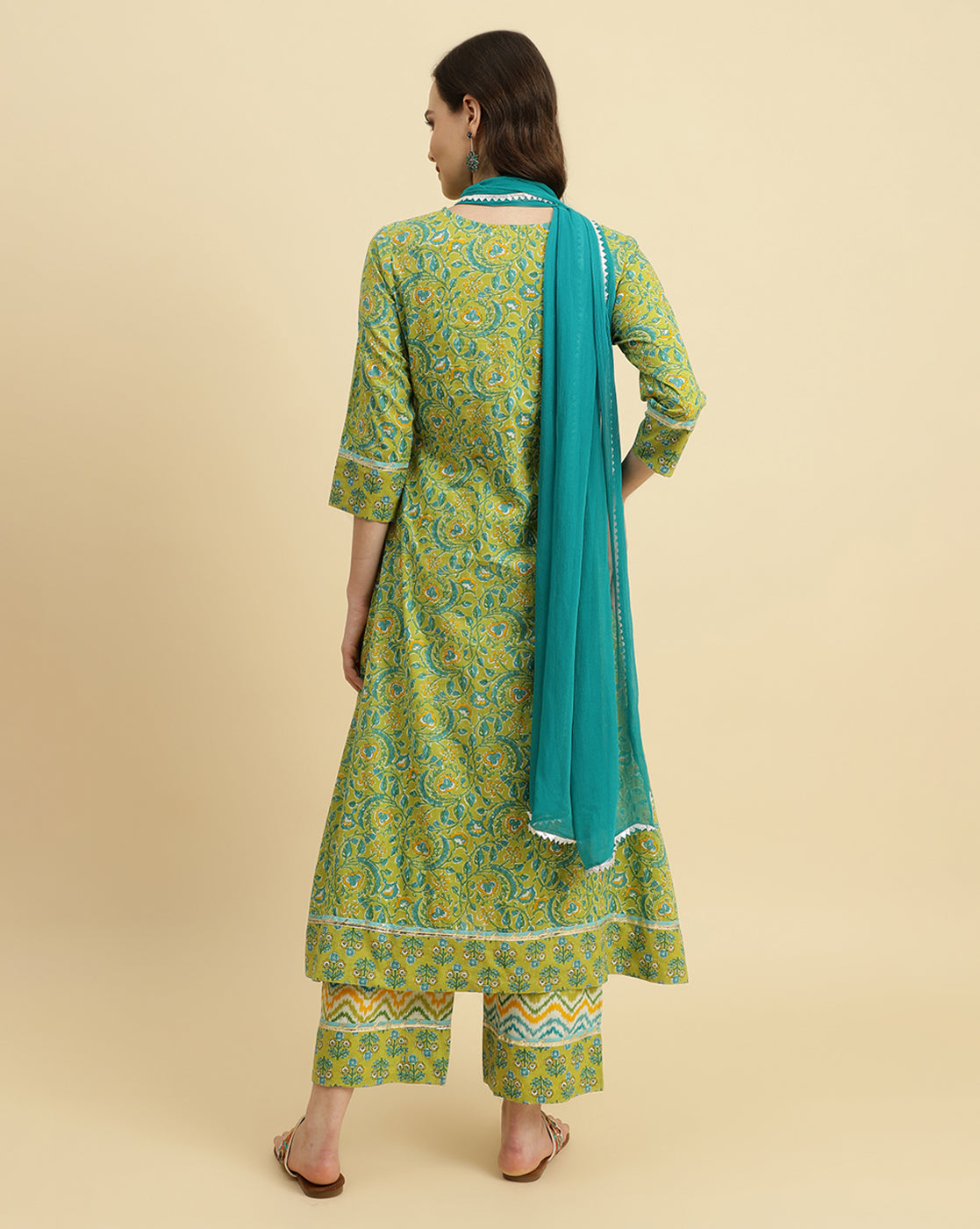 Green Floral Printed A-Line Kurta With Yoke Design And Embellished With Gota And Mirror Lace,Kurta Paired With Palazzo And Chiffon Dupatta,3/4Th Sleeves , Round Neckline