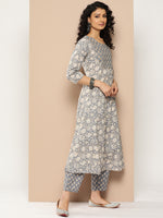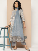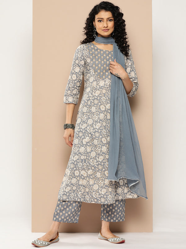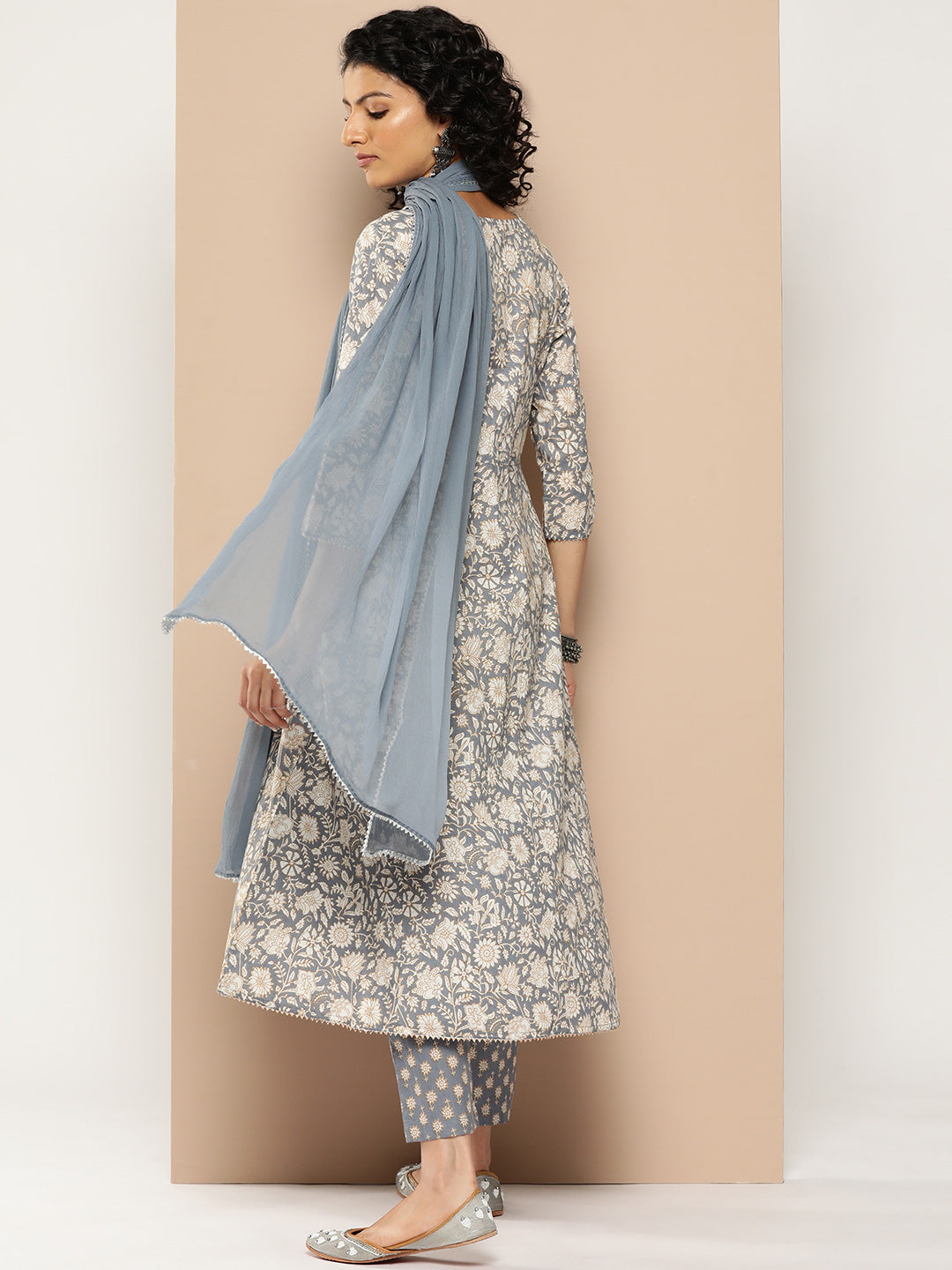 Grey Floral Printed Printed Anarkali Kurtawith Sequin And Gotta Embellishment On Yoke, Paired With Straight Printed Trouser And Tonal Chiffon Dupatta,Kurta With Round Neck And Three Quarter Sleeves