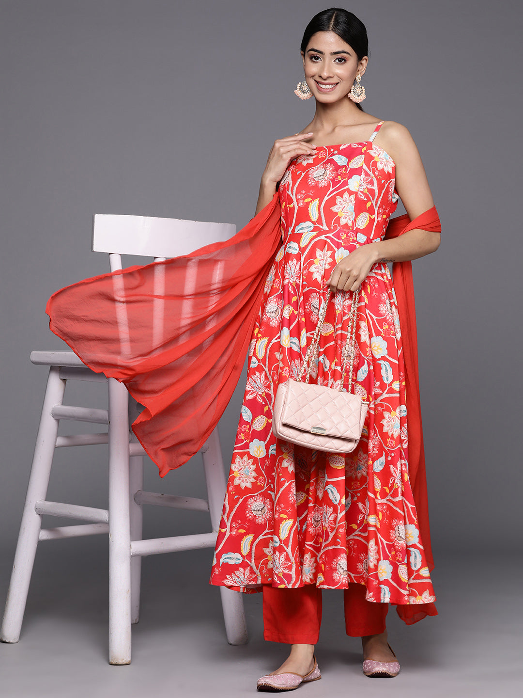 Red Floral Printed Strap Style Anarkali Kurta With Square Neck Paired Tonal Solid Bottom And Solid Dupatta