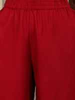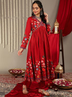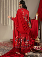 Red Floral Printed V-Neck Anarkali Kurta Paired With Tonal Bottom And Tonal Solid Chiffon Dupatta With Four Side Traingle Gota Lace
