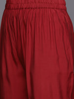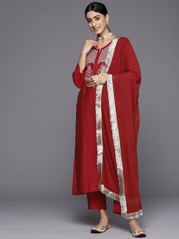 Red Three Quarter Sleeve, Round Neck, Yoke With Zari, Thread And Sequin Embroidered Straight Kurta With Side Slits. Paired With Tonal Solid Bottom And Tonal Organza Dotted Dupatta.