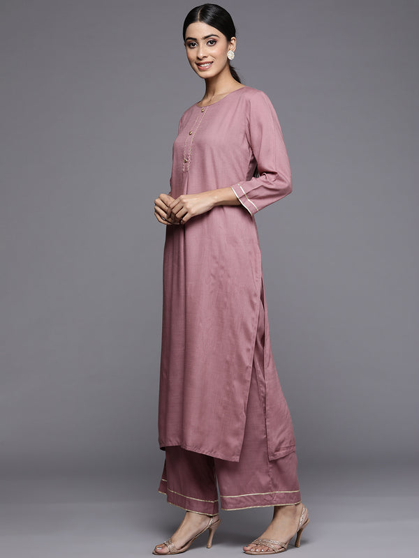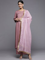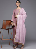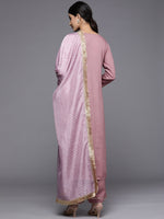 Mouve Straight Kurta With Solid Bottom And Floral Printed Dupatta, Kurta Has Lace Detailings, Gas Rond Neck And Three Quarter Sleeves