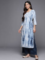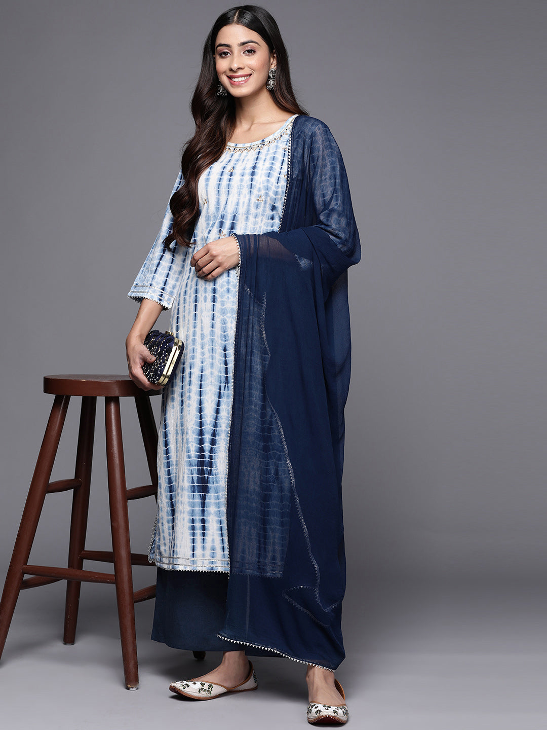Varanga Women Straight Kurta With Round Neck Paired With Blue Solid Palazzo And Blue Solid DupattaWhite And Blue Shibori Printed Kurta With Gota Em...