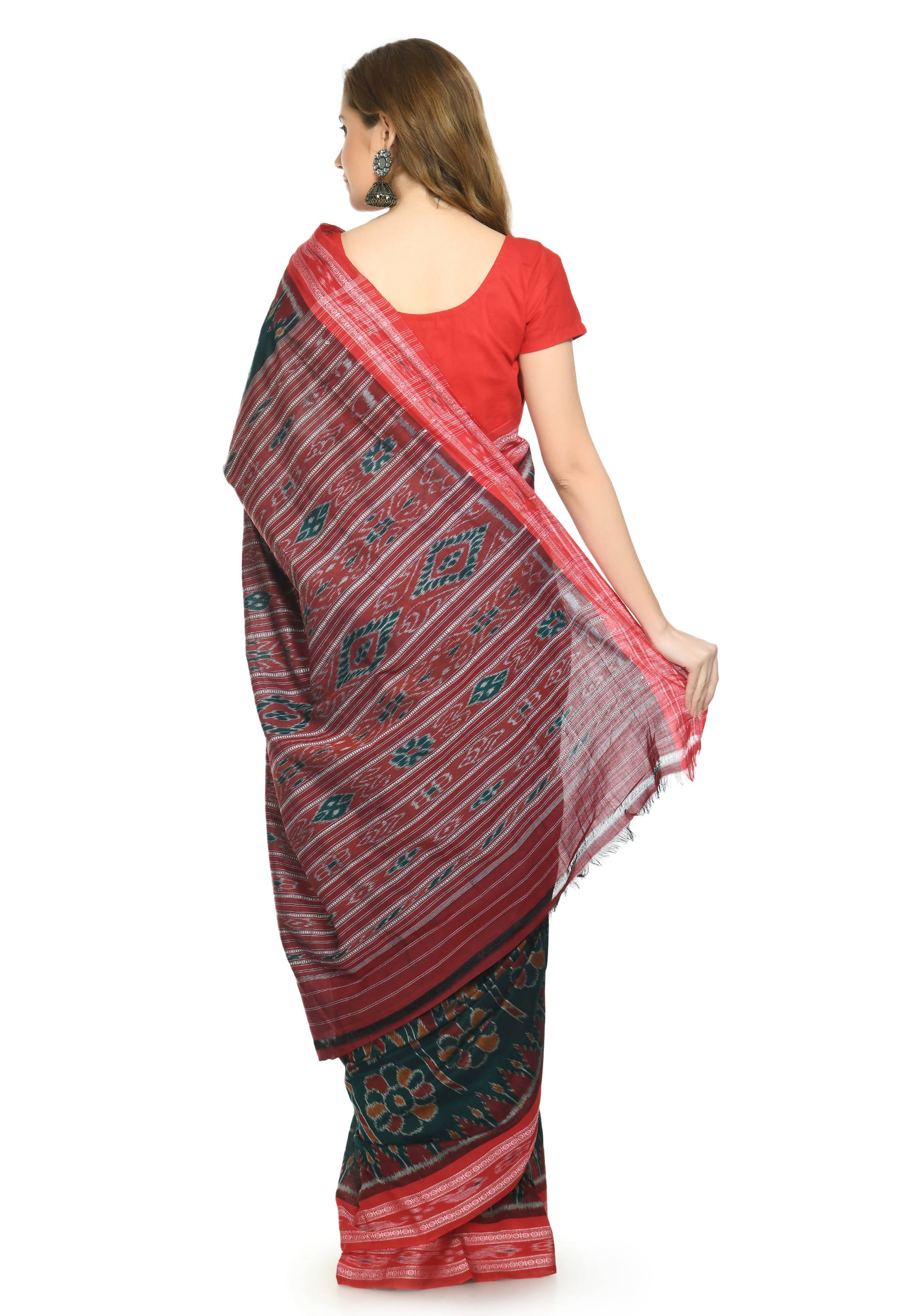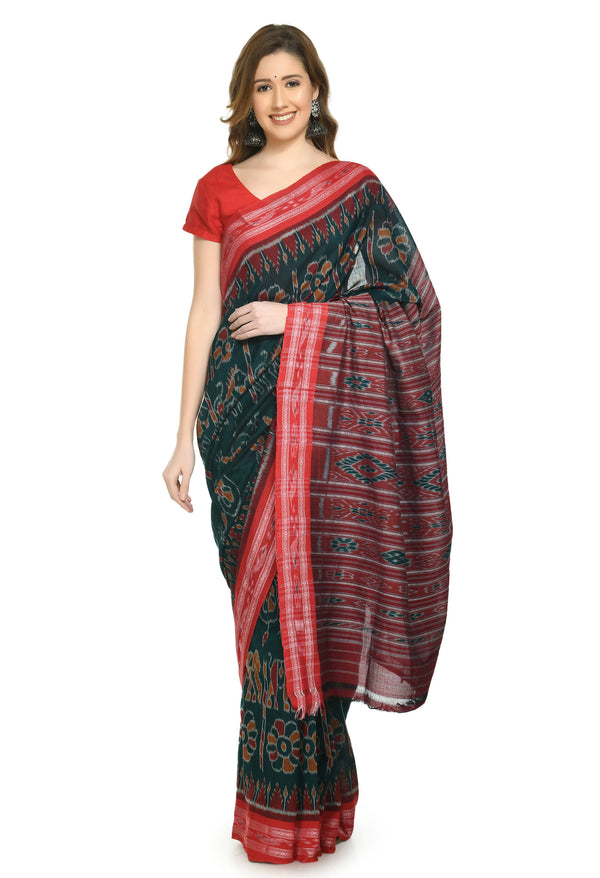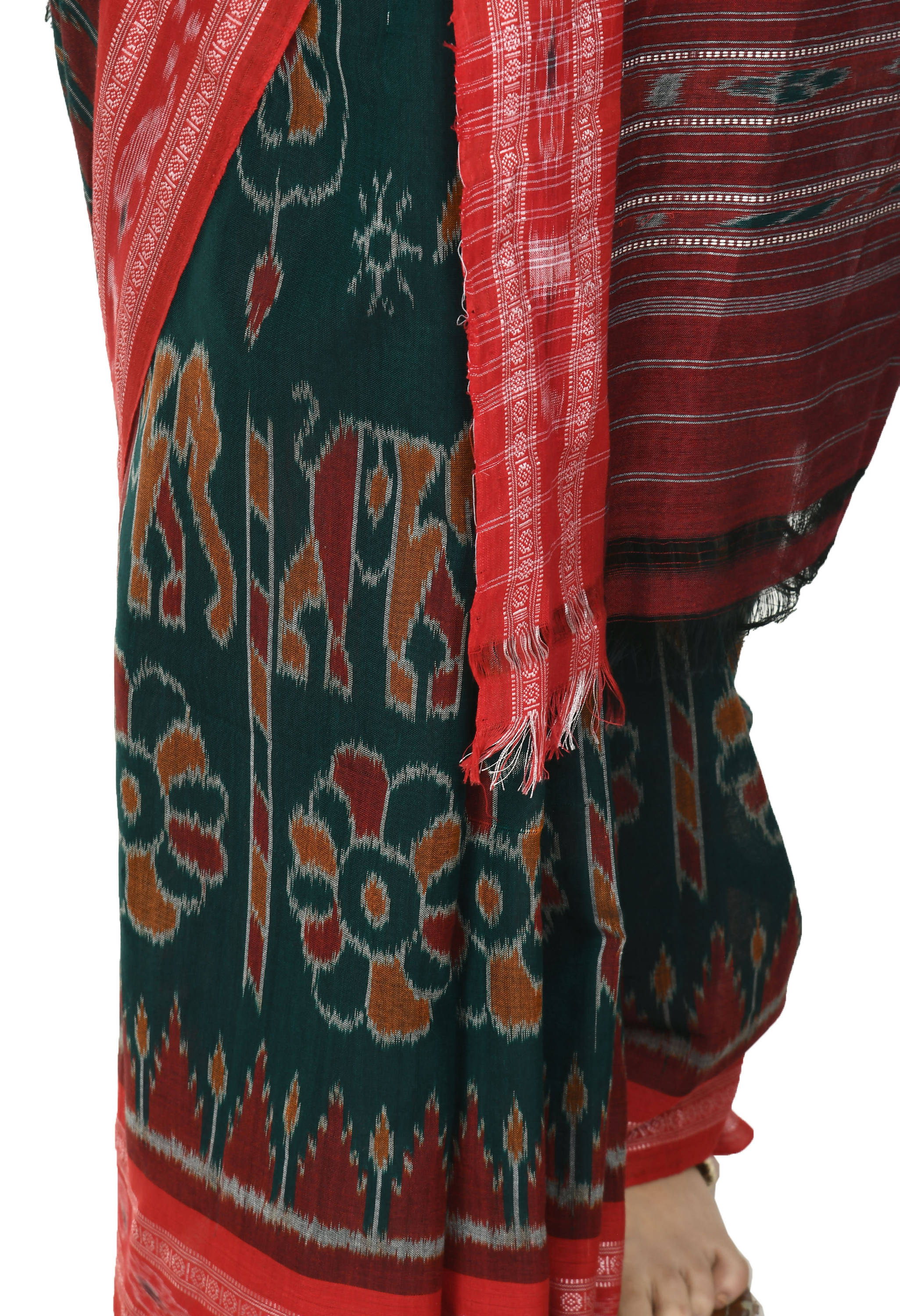 Vamika Sambalpuri Ikat Cotton Dehabandha Green & Red Saree
