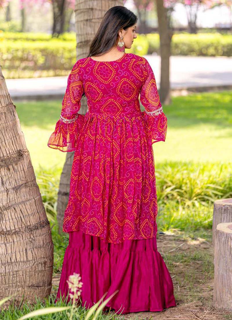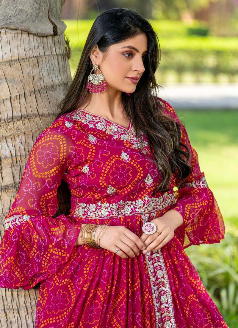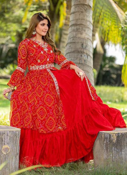 Prazu Fashion Red Pink Bandhej Embroidered Top With LehengaTop:-Fabric - Pure BandhejWork - Heavy Embroidery With Thread WorkInner - Micro CottonL...